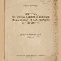 II - SAR | 945.9 : III | TARRipristino del Museo lapidario olbiense nella chiesa di San Simplicio in Terranova / Antonio Taramelli. - Milano ; Roma : Casa editrice d'arte Bestetti e Tumminelli, [1923?]. - [3] c. : ill. ; 30 cm. - Estr. da: “Bollettino d'arte del Ministero della pubblica istruzione”, 17 (1923/24) p. 43-47. Con dedica ms. dell’autore: “Una vittoria ottimale. Ad Emilio Lussu … A Taramelli”Dedica ms. dell’autore: “Una vittoria ottimale. Ad Emilio Lussu che ne preparò molte e più sanguinose, A. Taramelli”. -