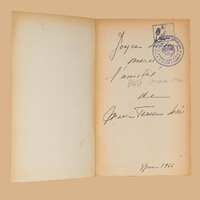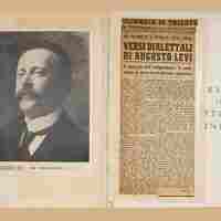 I - GEN | 850 : II | LEVVersi in dialetto triestino / di Augusto Levi. - Trieste : editore l'autore, 1915 (Stab. art. tip. G. Caprin). - 63 p. ; 23 cm.A p. 3. dedica ms. “Natale 1964. All’On. Emilio Lussu, questi versi di mio nonno con sinceri auguri, Paolo Padovani”. Incollato con una strisciolina di tela alla copertina anteriore un ritaglio de «Il Piccolo» del 30 settembre 1964 che dà notizia della pubblicazione (a beneficio della Lega) del volume di poesie di Augusto Levi, poeta e giornalista triestino, figura importante dell’irredentismo. Incollato con una strisciolina di tela alla copertina posteriore un ritaglio di giornale che commemora la morte di Augusta Segré nata Levi, figlia di Augusto. -