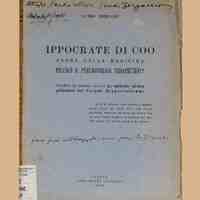 I - GEN | 610.9 | BERIppocrate di Coo padre della medicina praticò il pneumotorace terapeutico? : stralcio da inedita opera: Le malattie pleuropolmonari nel Corpus Hippocraticum / Guido Bergamo. - Padova : Gregoriana, 1950. - 115 p., 1 c. di tav. : ill. ; 8.Dedica ms. dell’a. nella cop. “All'on. Emilio Lussu, eroico comandante di buone battaglie, l’antico collega Guido Bergamo. Mestre, 16/11/1950”. Sotto il titolo segue “forse può interessarti, ma forse, la II parte. GB”