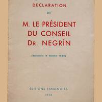 I - GEN | 946 | NEGDéclaration de M. le président du Conseil Dr. Negrín : Barcelone 14 octobre 1938. – [S.l.] : Éditions Espagnoles, 1938. – 12 p. ; 16 cm.Nella cop. “Lussu”. -