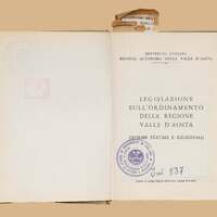 I - GEN | 945.11 | VALLegislazione sull'ordinamento della regione Valle d' Aosta : (norme statali e regionali) / edito a cura della regione Valle d' Aosta. - 2. ed. - Aosta : Tip. artigiana, pref. 1963. - VIII, 914 p. ; 17 cm. - In testa al front.: Regione autonoma della Valle d'AostaBusta da lettera indirizzata “Al compagno Sen. Emilio Lussu, Gruppo PSIUP, Senato della Repubblica” con affrancatura del 1967; dentro la busta comunicato stampa del PSIUP, Federazione della Valle d'Aosta, datato Aosta 2 ottobre 1967 che rende nota la denuncia del Presidente della giunta regionale di centro sinistra effettuata dalla Federazione regionale del PSIUP per avere violato lo statuto speciale in merito alla convocazione dei comitati elettorali. Appunti ms. e ds. con “Emendamenti aggiuntivi al DDL 2350. -