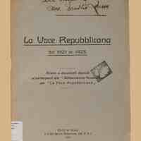 I - GEN | 324.2 : III | VOC | 1-2La voce repubblicana dal 1921 al 1925 : ricordi e documenti dedicati ai partecipanti alla Sottoscrizione nazionale per La voce repubblicana. - Roma : a cura della Direzione del P.R.I., 1925. - 63 p. : ill. ; 24 cm.Posseduto in due copie, una delle quali con dedica ms. nella cop. “All’onorevole avv. Emilio Lussu”. -