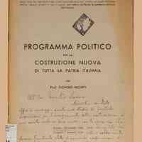 I - GEN | 945 : V.5 | IACProgramma politico per la costruzione nuova di tutta la patria italiana / di Dionisio Iacurti. - Roma : Tipografia F. Centenari, 1945. - 48 p. ; 25 cm. - In testa alla cop.: Associazione per la riforma tra i cittadini che ... non vedono nel Partito la necessaria salvezza dell'umanitàSulla cop. dedica ms. dell'a. “All'On. Emilio Lussu, Ministro di Stato, offro in omaggio questo mio studio di pratiche disposizioni per il conseguimento della costruzione di una società civile su basi nuove, con la speranza che esse siano tali da potervi saldamente elevare l'ambiente eletto di concorde cooperazione di tutti per il bene di ogni cittadino nostro in armonia con quello delle geti di tutta la terra. Dionisio Iacurti”. -
