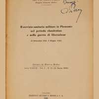 I - GEN | 945 : V.5 | PERIl servizio sanitario militare in Piemonte nel periodo clandestino e nella guerra di liberazione : (8 settembre 1943-8 giugno 1945) / Stefano Perrier. – Torino : Minerva medica, 1946. – 23 p. ; 21 cm. – Estr. da: “Minerva medica”, 37(1946), vol. 1, n. 12.Sulla cop. dedica ms.: “Devoto e affettuoso omaggio, S. Perrier”. -