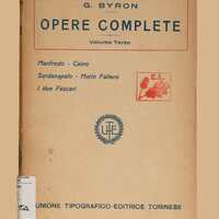 Byron George Gordon820 | BYROpere complete / Giorgio Byron. - Ed. definitiva.Torino : UTET. - 5 v. ; 20 cm. 1: Il pellegrinaggio del giovine Aroldo ; Profezia di Dante - 1917. 2: Il Giaurro ; La sposa d’Abido ; Il corsaro ; Lara ; L’assedio di Corinto ; Parisina ; Il prigioniero di Chillon ; Mazeppa ; L’isola ; Le lagrime ; L’addio ; Le tenebre ; Lamento del Tasso ; La morte di Calmar e d’Orla - 1917. 3: Manfredo ; Caino ; Sardanapalo ; Marino Faliero ; I due Foscari Byron. - 1917. 5: Componimenti varii / Giorgio Byron ; traduzione di Carlo Rusconi. - 1922.Nel front. dei vol. 1-3, 5 “Lussu” ms. Nel vol. 5 cartolina, dat. Messina, 13.3.55 con firma di Joyce Lussu. -