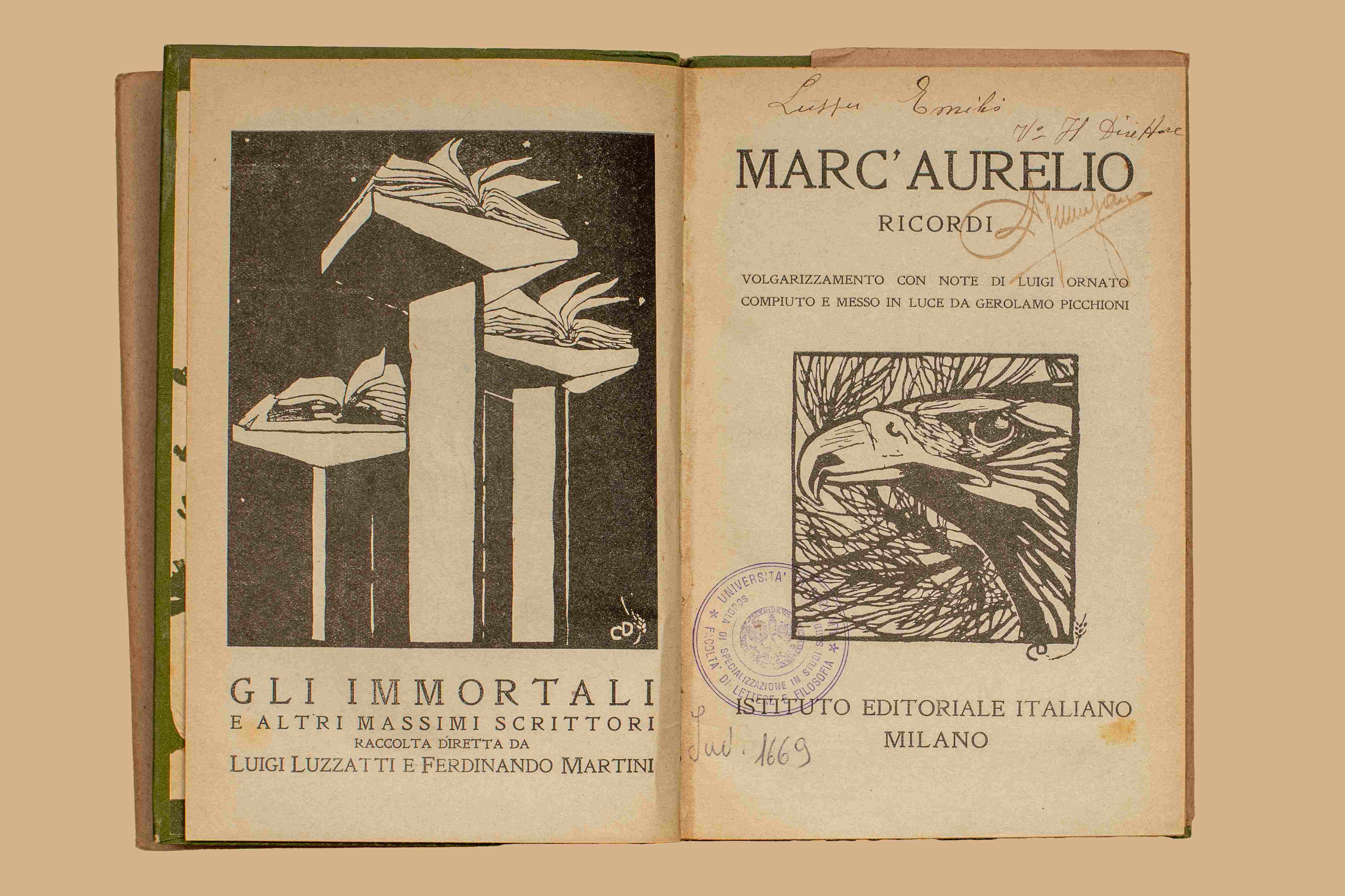 Titolo: Ricordi / Marc’Aurelio : volgarizzamento con note di Luigi Ornato ; compiuto e messo in luce da Gerolamo Picchioni. - Milano : Istituto editoriale italiano, [1914?]. - 236 p. ; 20 cm. - (Gli immortali e altri massimi scrittori ; 24).