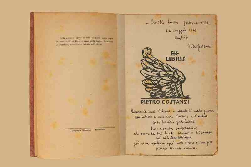 - Dopo il front. è incollata una pagina contenente l’ex libris di Pietro Costanzi e la dedica ms.; “A Emilio Lussu, fraternamente, 24 maggio 1925, Cagliari. Pietro Costanzi” seguita da: “Quaranta mesi di buona - ottanta di mala guerra non valsero a smorzare l’ardore e l’ardire per la giustizia e per la libertà, breve e santa costellazione che oscurata dai biechi fantasmi del passato sul cielo basso della patria più viva sfolgora oggi nelle nostre anime fide, presagio del certo avvenire”.