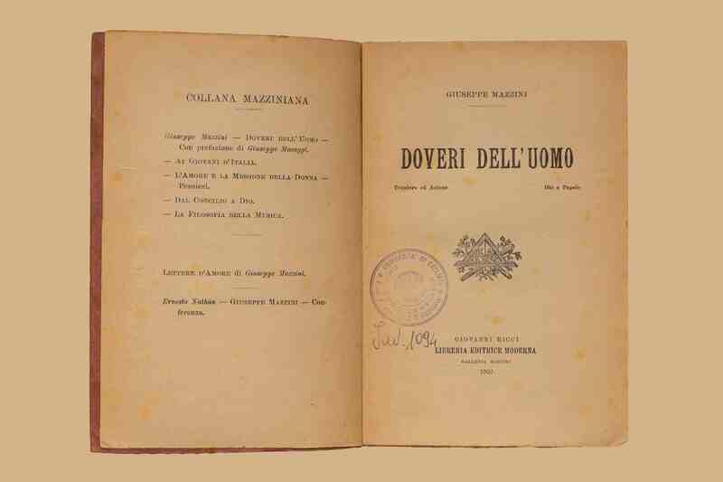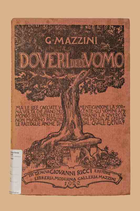Titolo: Doveri dell'uomo : pensiero ed azione, Dio e popolo / Giuseppe Mazzini. [Genova] : G. Ricci Libreria editrice moderna, 1922. - XVI, 230 p., [2] c. di tav. : ill. ; 25 cm. - (Collana mazziniana)