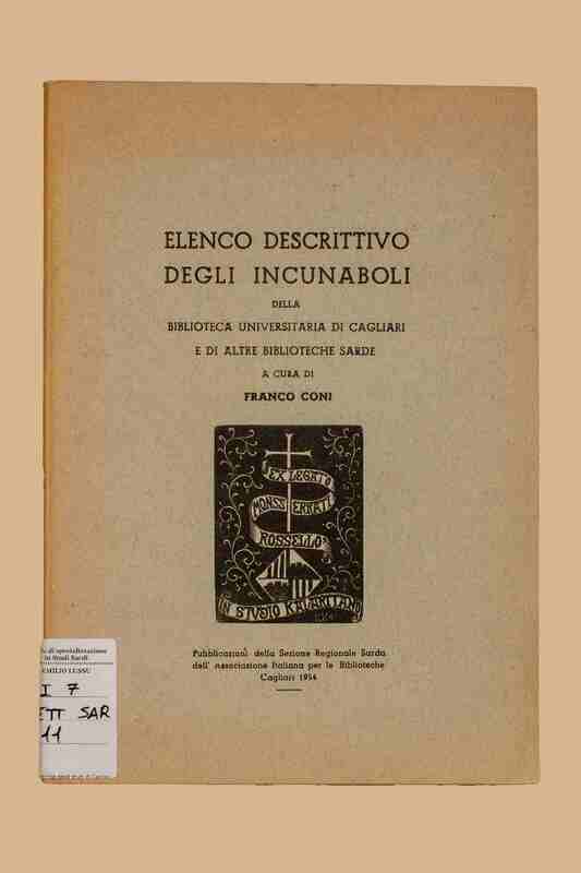 - Elenco descrittivo degli incunaboli della Biblioteca universitaria di Cagliari e di altre biblioteche sarde / a cura di Franco Coni. - Cagliari : Sezione regionale sarda dell'Associazione italiana per le biblioteche, 1954. - 57 p. : ill. ; 25 cm. - (Pubblicazioni della Sezione regionale sarda dell'Associazione italiana per le biblioteche)