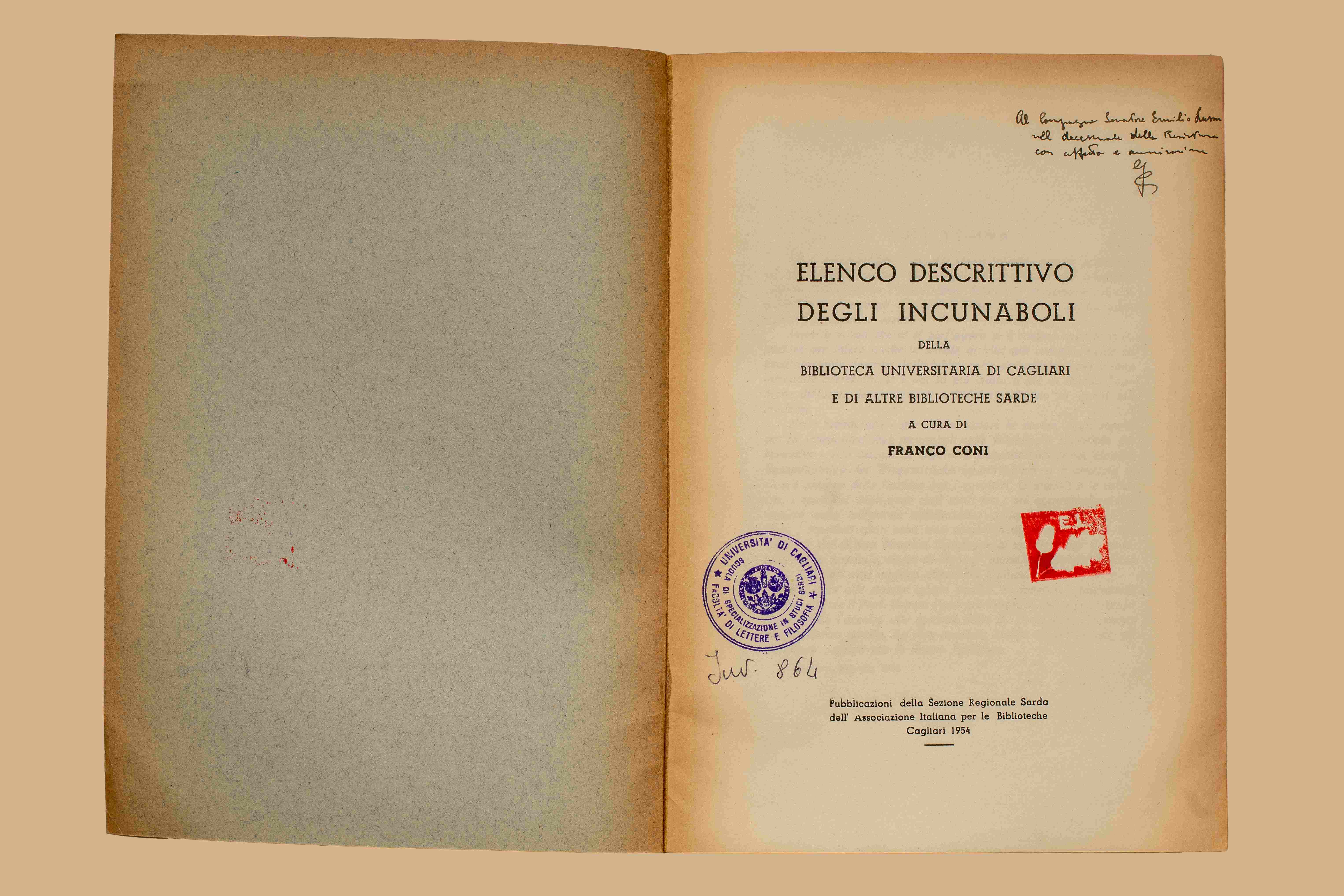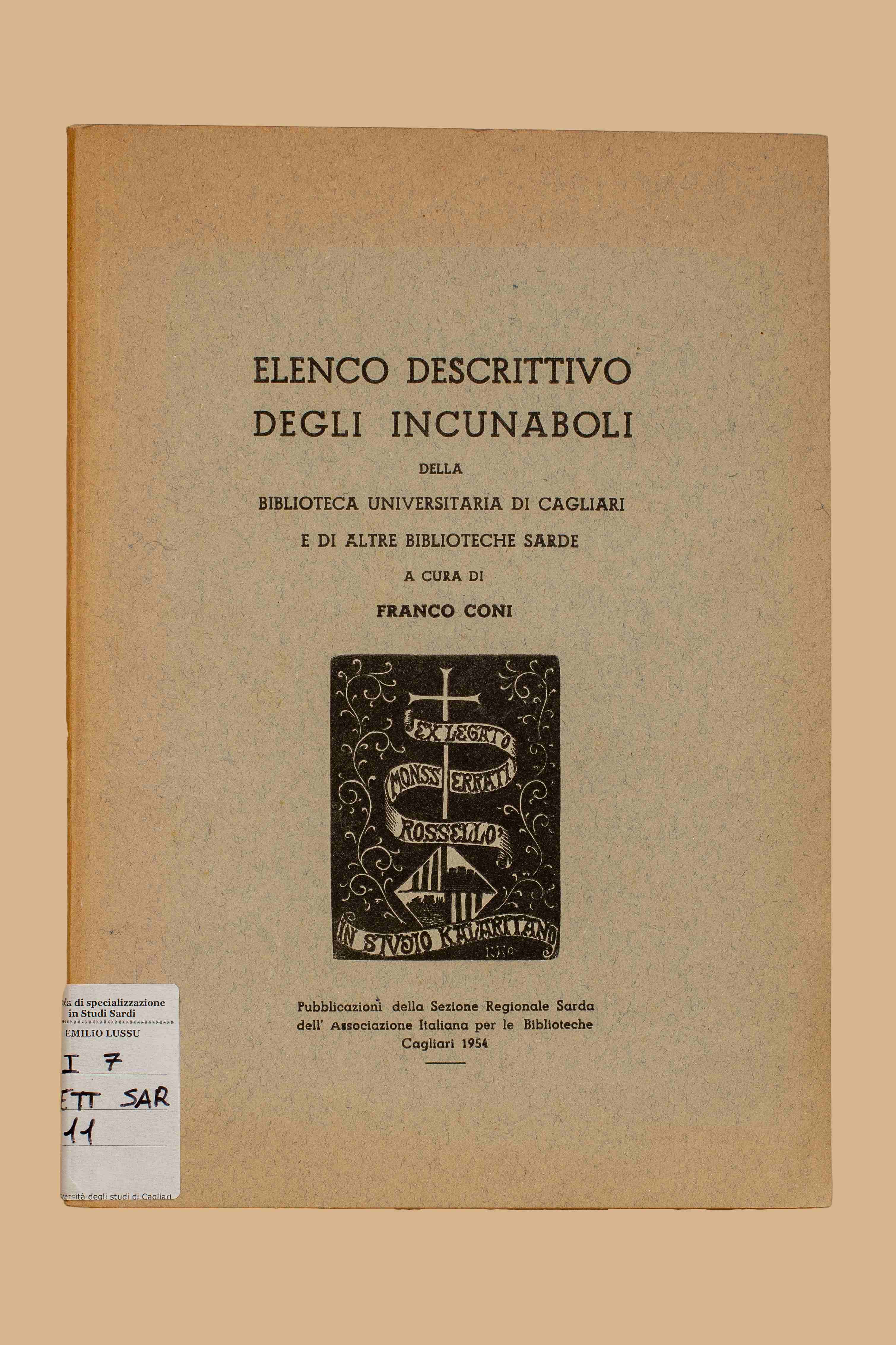 Titolo: Elenco descrittivo degli incunaboli della Biblioteca universitaria di Cagliari e di altre biblioteche sarde / a cura di Franco Coni. - Cagliari : Sezione regionale sarda dell'Associazione italiana per le biblioteche, 1954. - 57 p. : ill. ; 25 cm. - (Pubblicazioni della Sezione regionale sarda dell'Associazione italiana per le biblioteche)