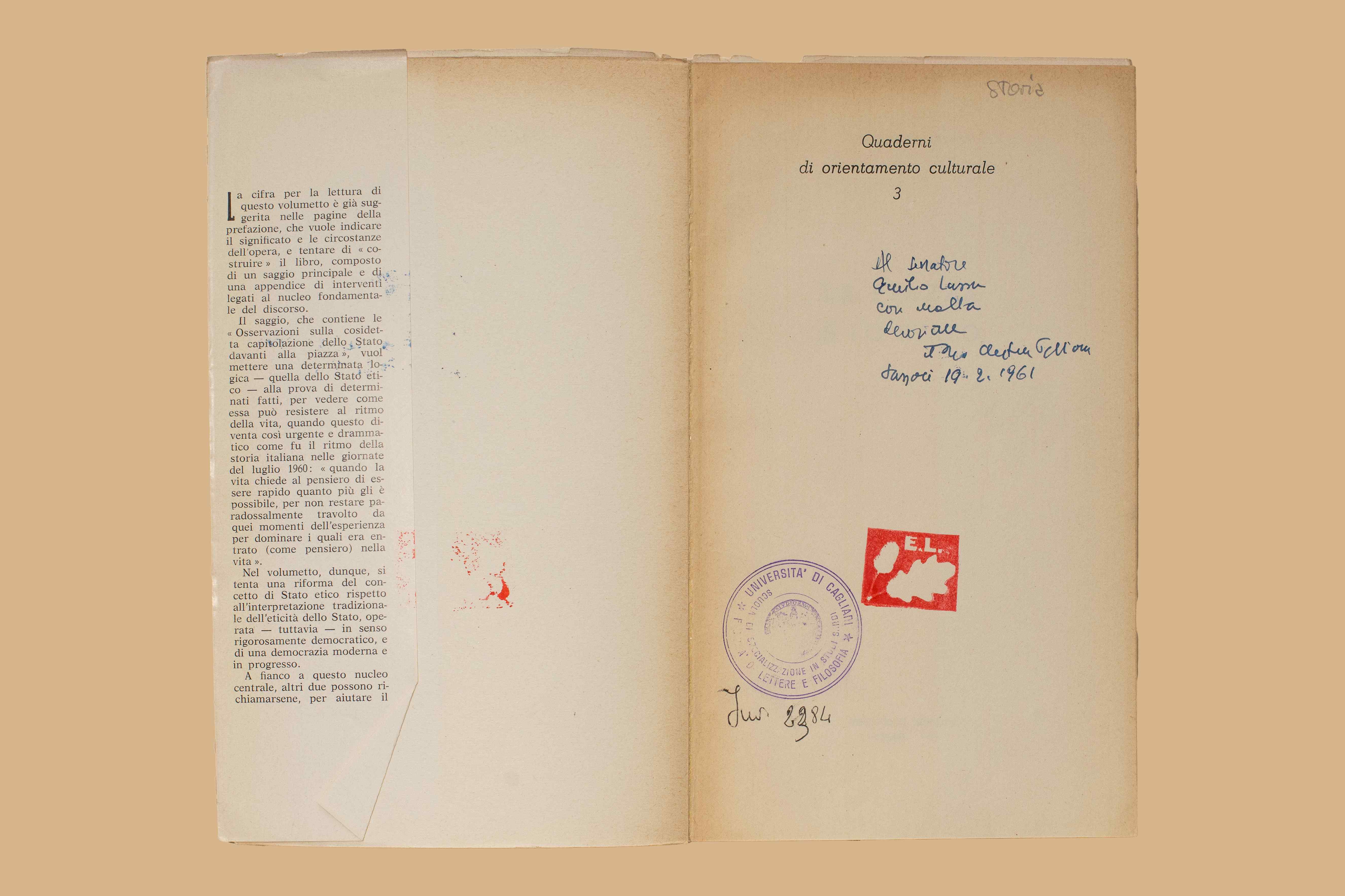 Note: Nell’occhietto dedica ms. dell’a. “Al senatore Emilio Lussu con molta devozione, … Sassari, 19.2.1961”. Cartolina da Tel Aviv, dat. 15.?.61.