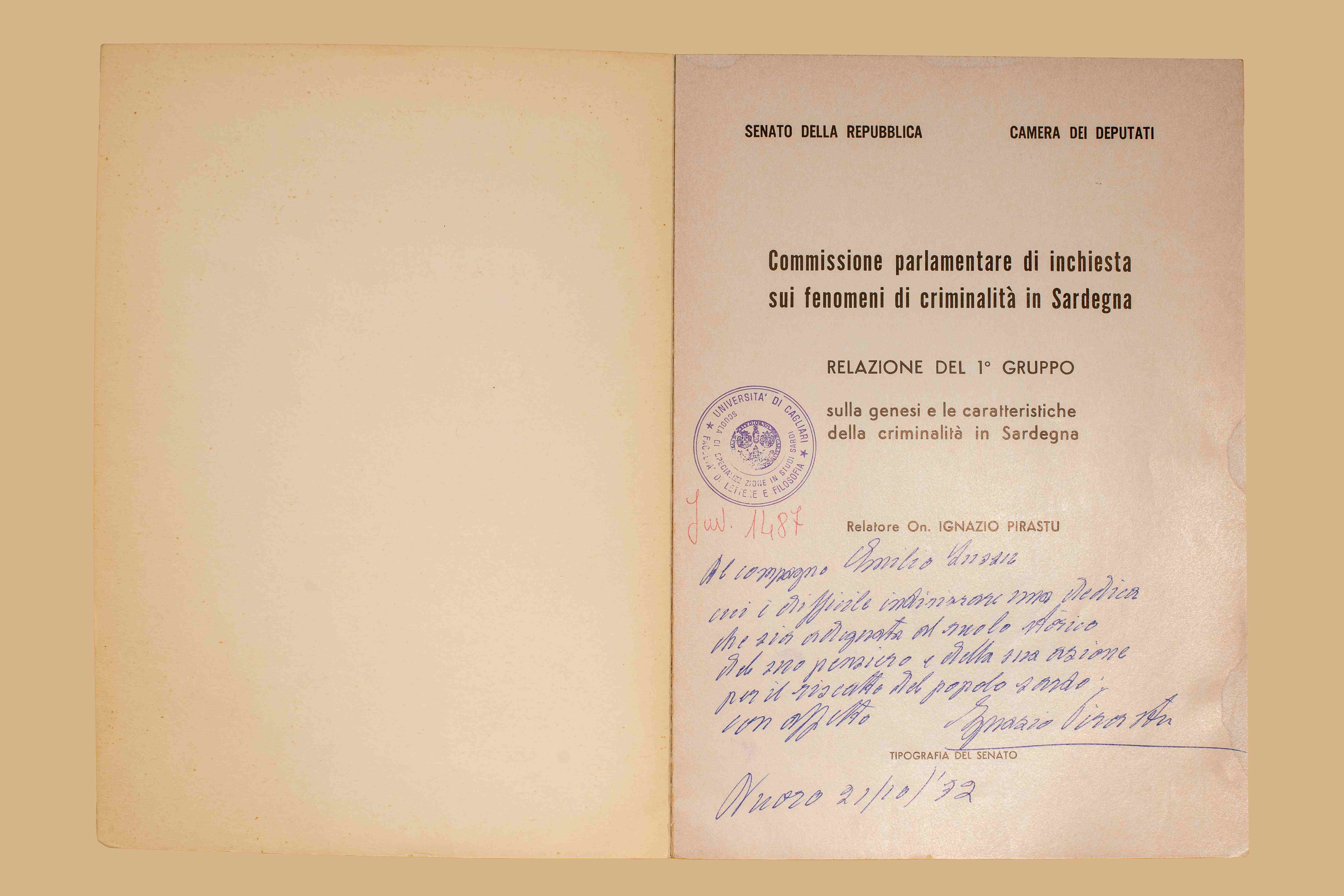 - Dedica ms. dell’a. sul front. “Al compagno Emilio Lussu cui è difficile indirizzare una dedica che sia adeguata al ruolo storico del suo pensiero e della sua azione per il riscatto del popolo sardo, con affetto, Ignazio Pirastu. Nuoro, 21/10/’72”.