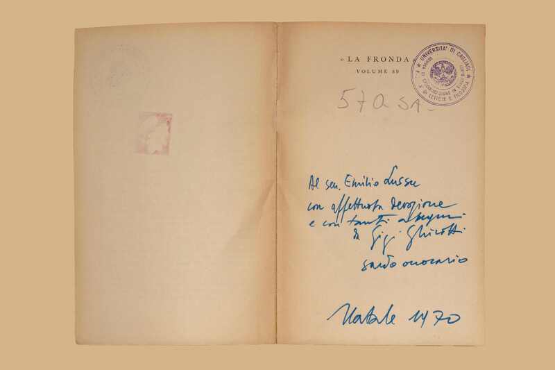 - Nell’occhietto dedica ms. dell’a. “Al sen. Emilio Lussu con affettuosa devozione e con tanti auguri da Gigi Ghirotti, sardo onorario, Natale 1970”.