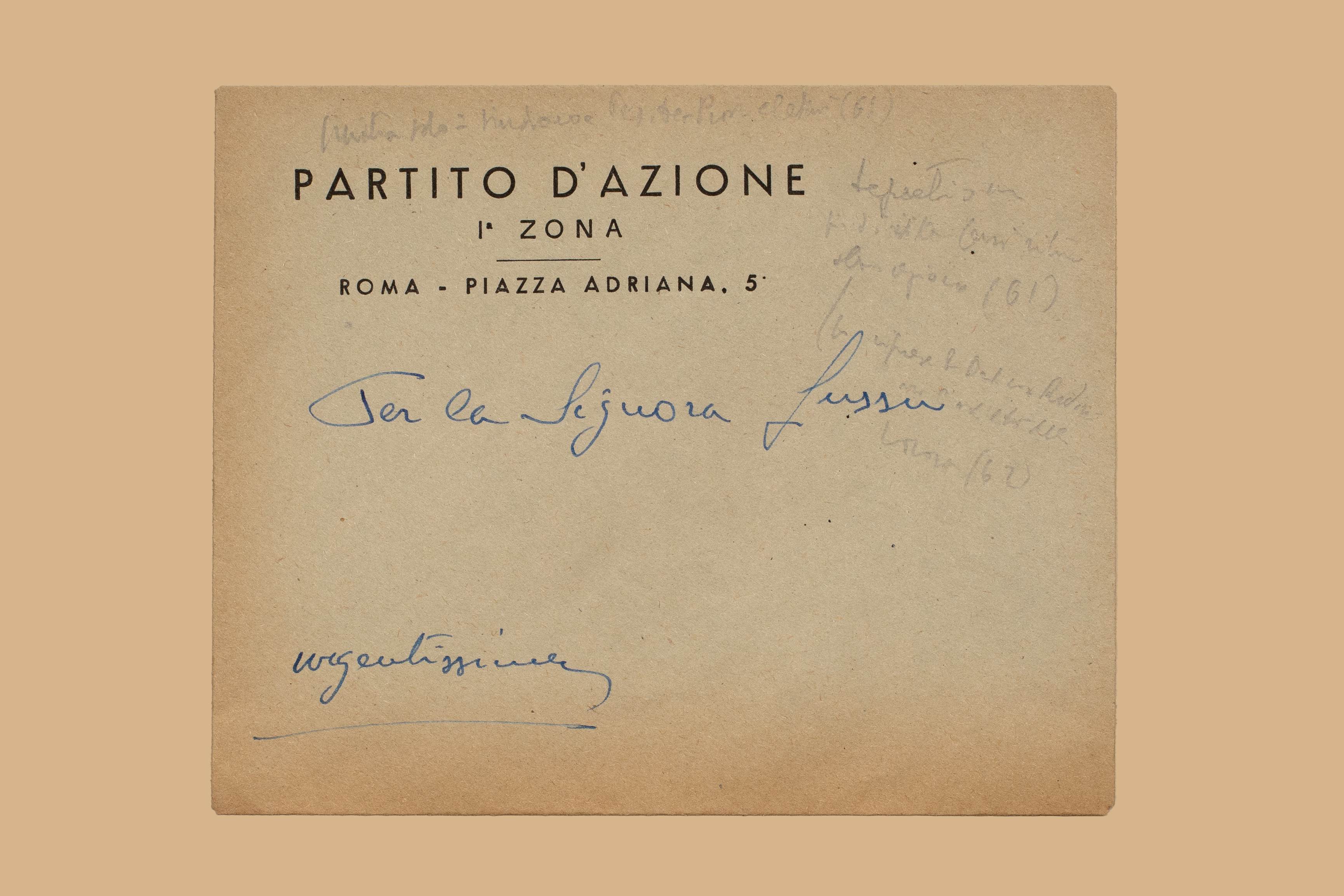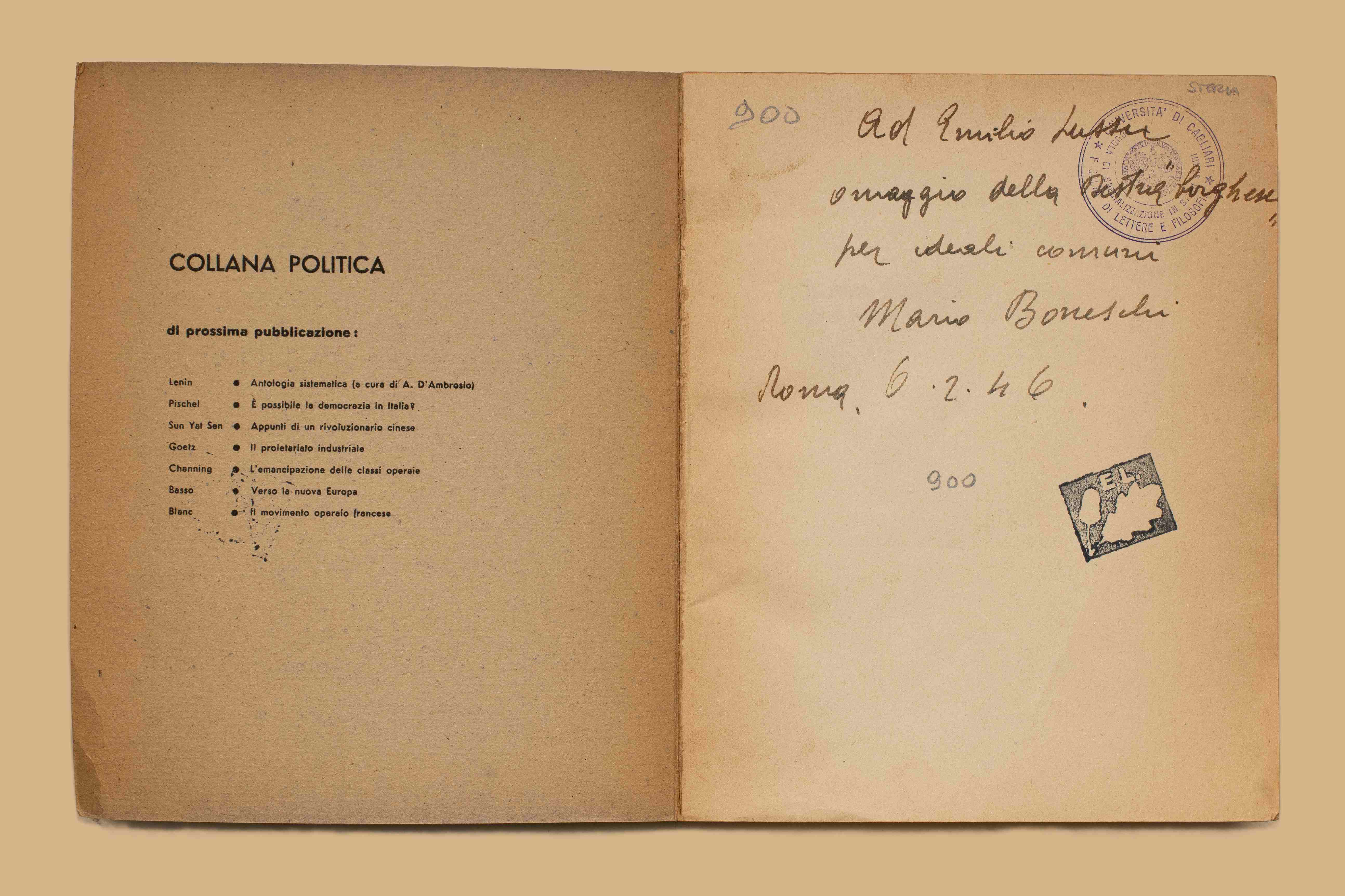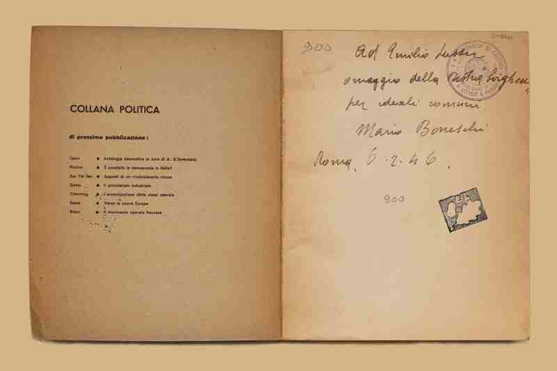- Dedica dell’a. nell’occhietto: “Ad Emilio Lussu, omaggio della “destra borghese” per ideali comuni, Mario Boneschi, Roma 6.2.46”. All'interno invito al 1. congresso del Partito d’Azione, Roma 4-6 febbraio 1946; busta da lettera con appunti mss.