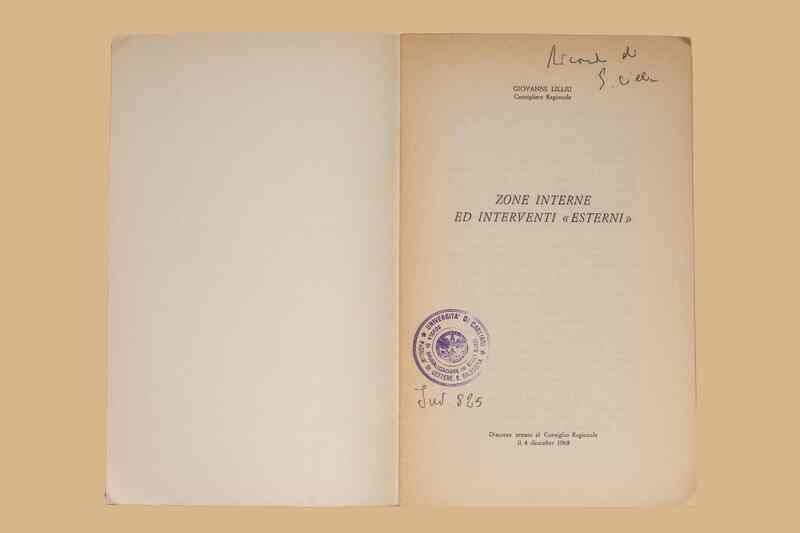 Titolo: Zone interne ed interventi esterni : discorso tenuto al Consiglio Regionale il 4 dicembre 1968 / Giovanni Lilliu ... - [S.l. : s.n.], stampa 1969 (Cagliari : Fossataro). - 15 p. ; 23 cm.