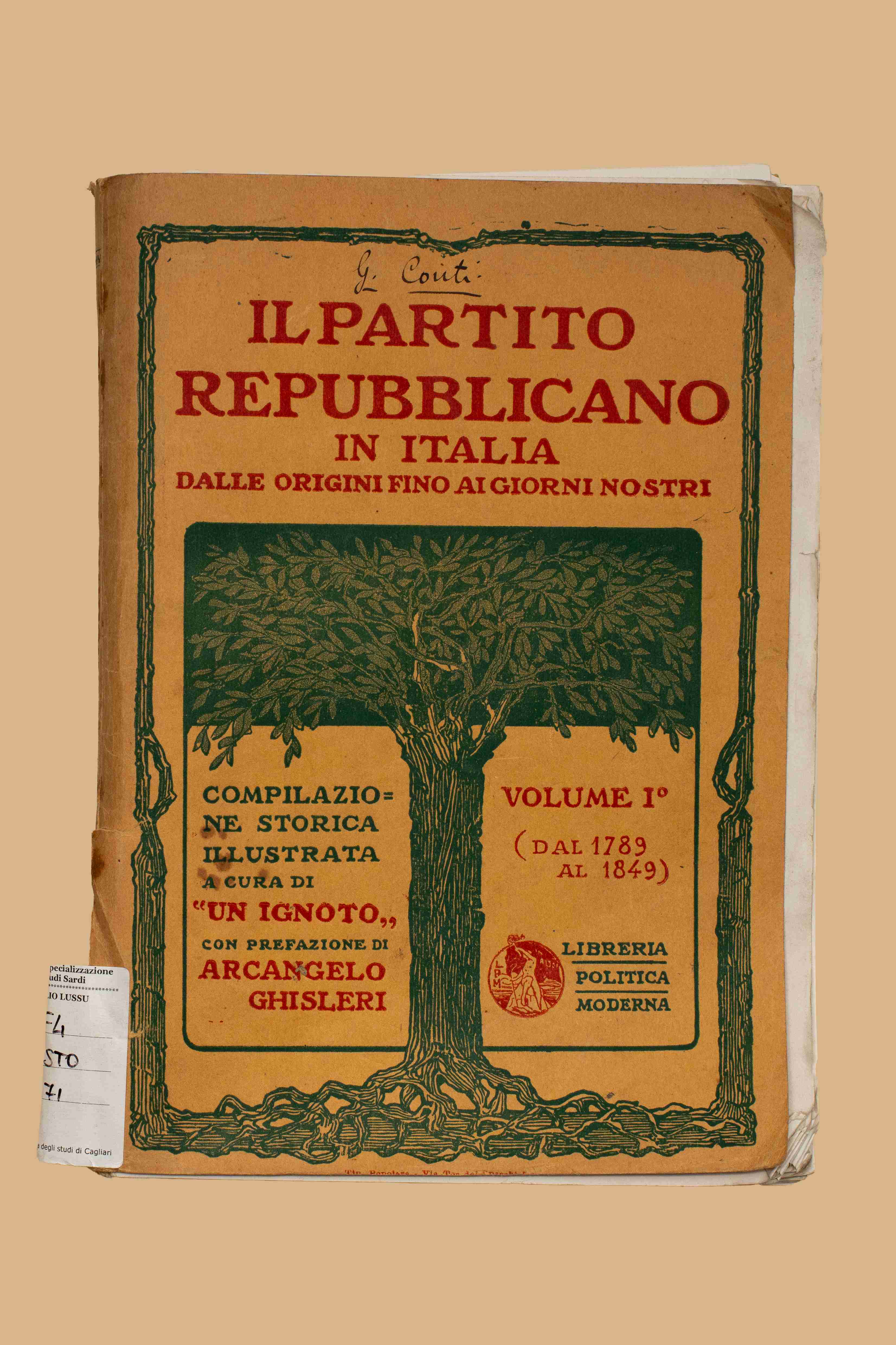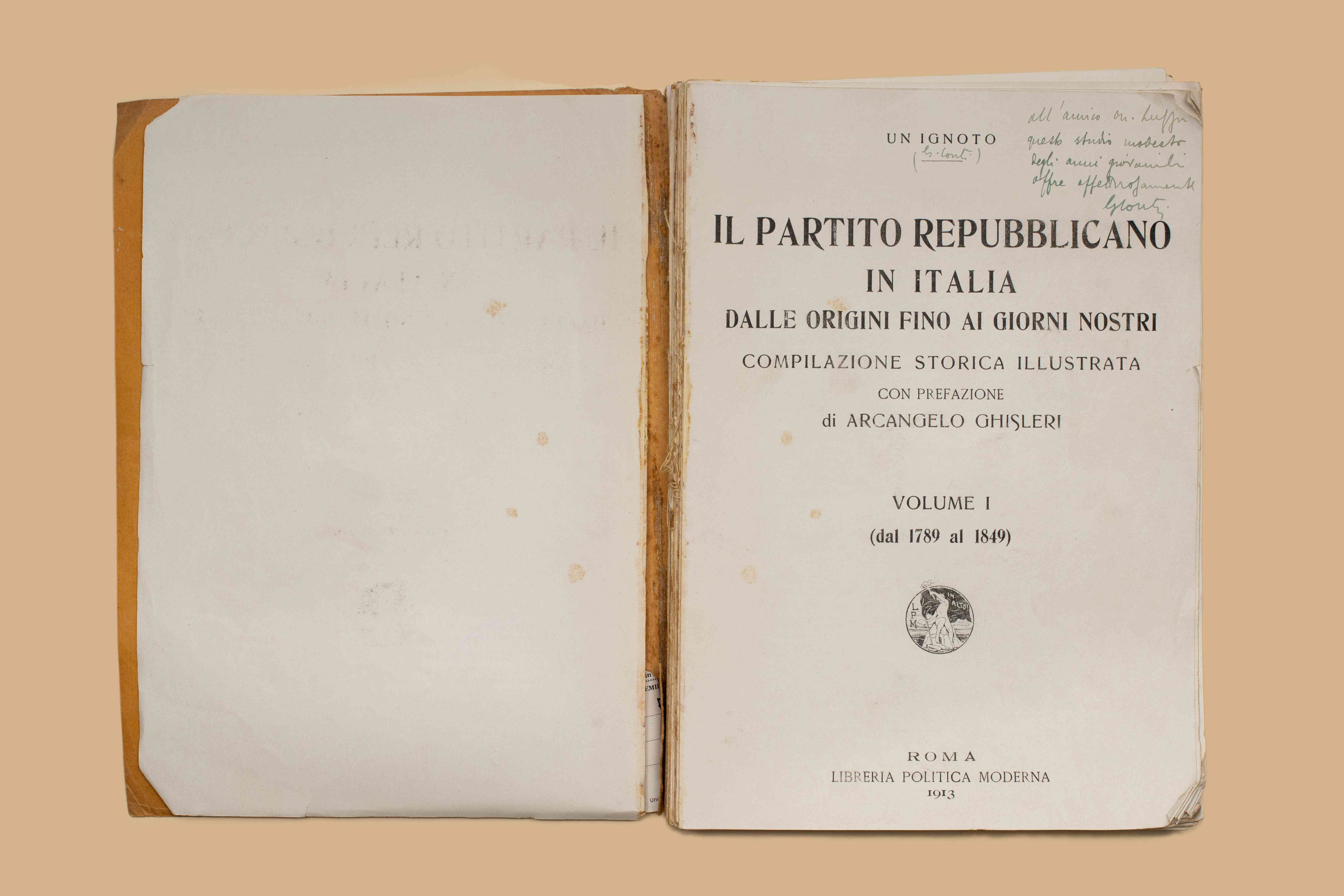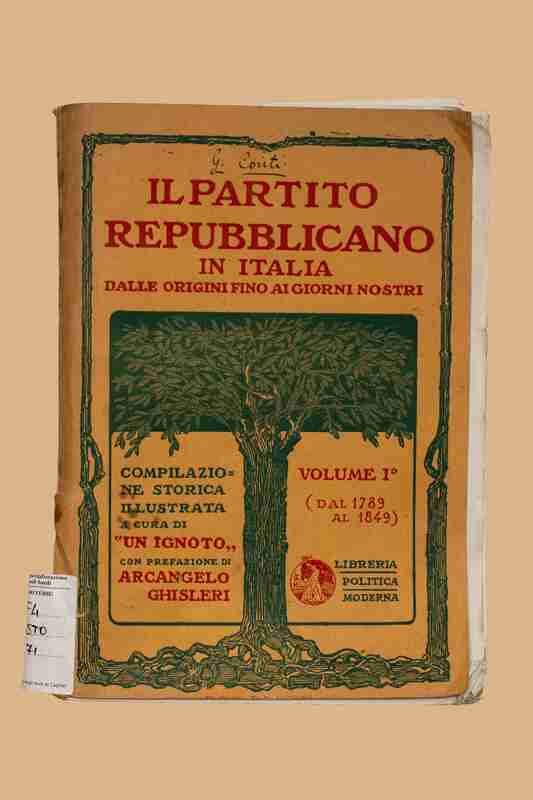 Titolo: Il Partito Repubblicano in Italia dalle origini fino ai giorni nostri : compilazione storica illustrata / un ignoto ; con prefazione di Arcangelo Ghisleri. Vol. 1: dal 1789 al 1849. - Roma : Libreria politica moderna, 1913. - VII, 340 p. : ill. ; 25 cm. - Autore : Giovanni Conti.