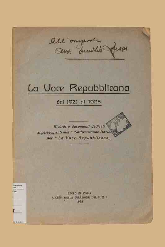 Titolo: La voce repubblicana dal 1921 al 1925 : ricordi e documenti dedicati ai partecipanti alla Sottoscrizione nazionale per La voce repubblicana. - Roma : a cura della Direzione del P.R.I., 1925. - 63 p. : ill. ; 24 cm.