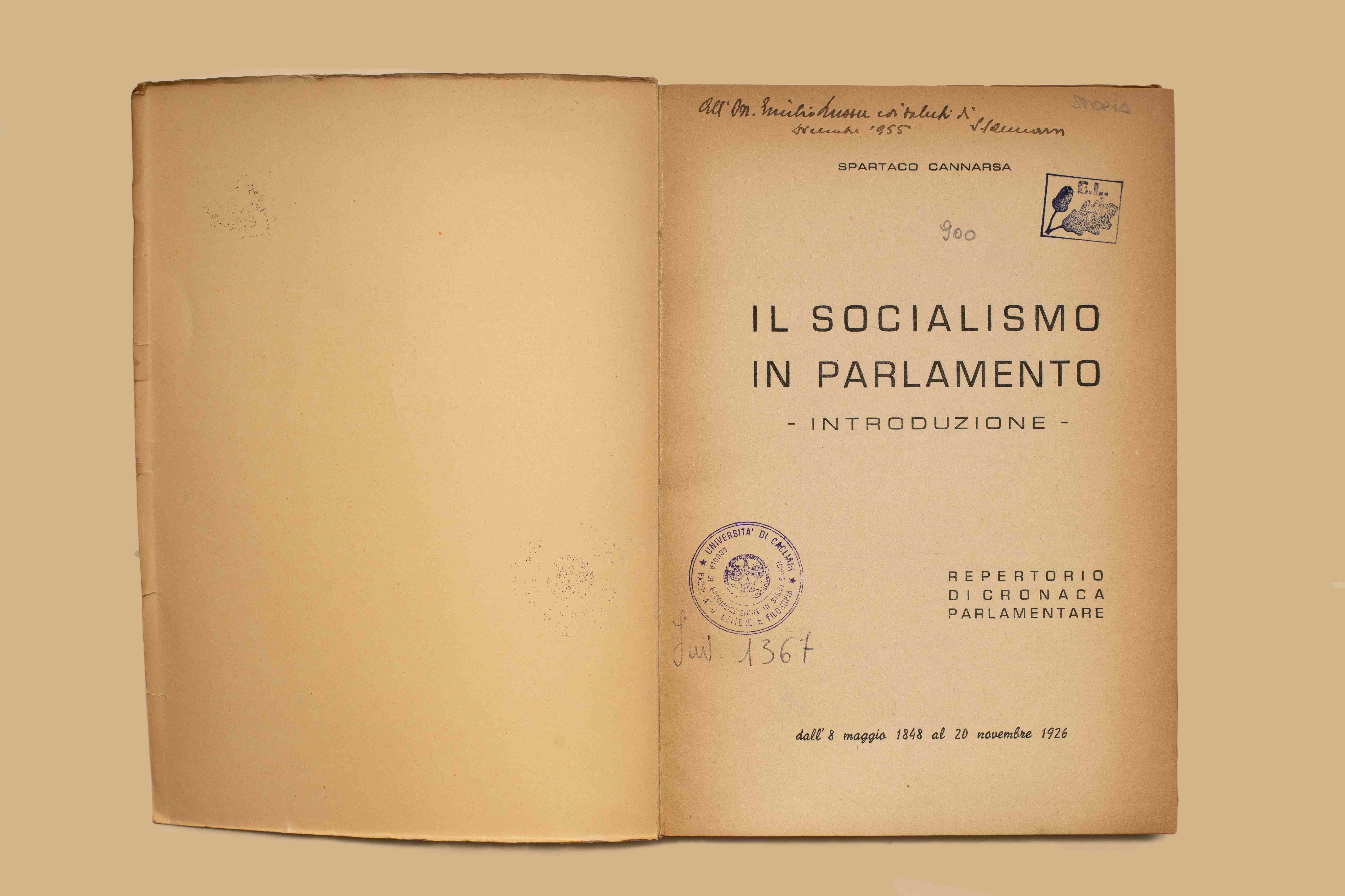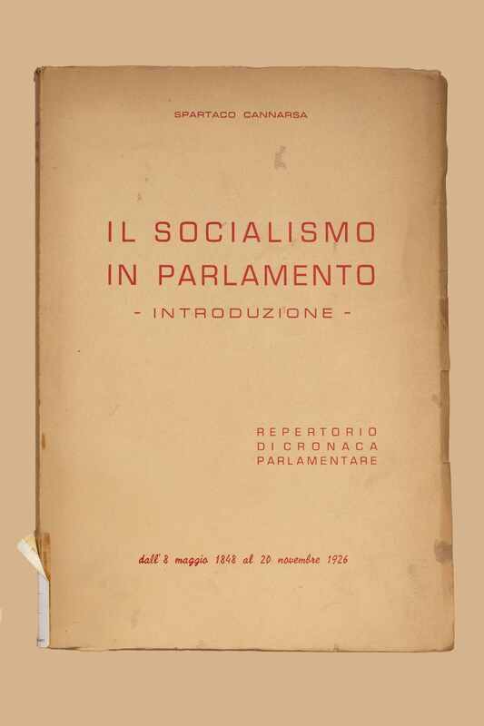 Titolo: Il socialismo in Parlamento : introduzione : repertorio di cronaca parlamentare dall'8 maggio 1848 al 20 novembre 1926 / Spartaco Cannarsa. Napoli : [s. n.], 1955 (Napoli : Raimondi). - 354 p. ; 24 cm.