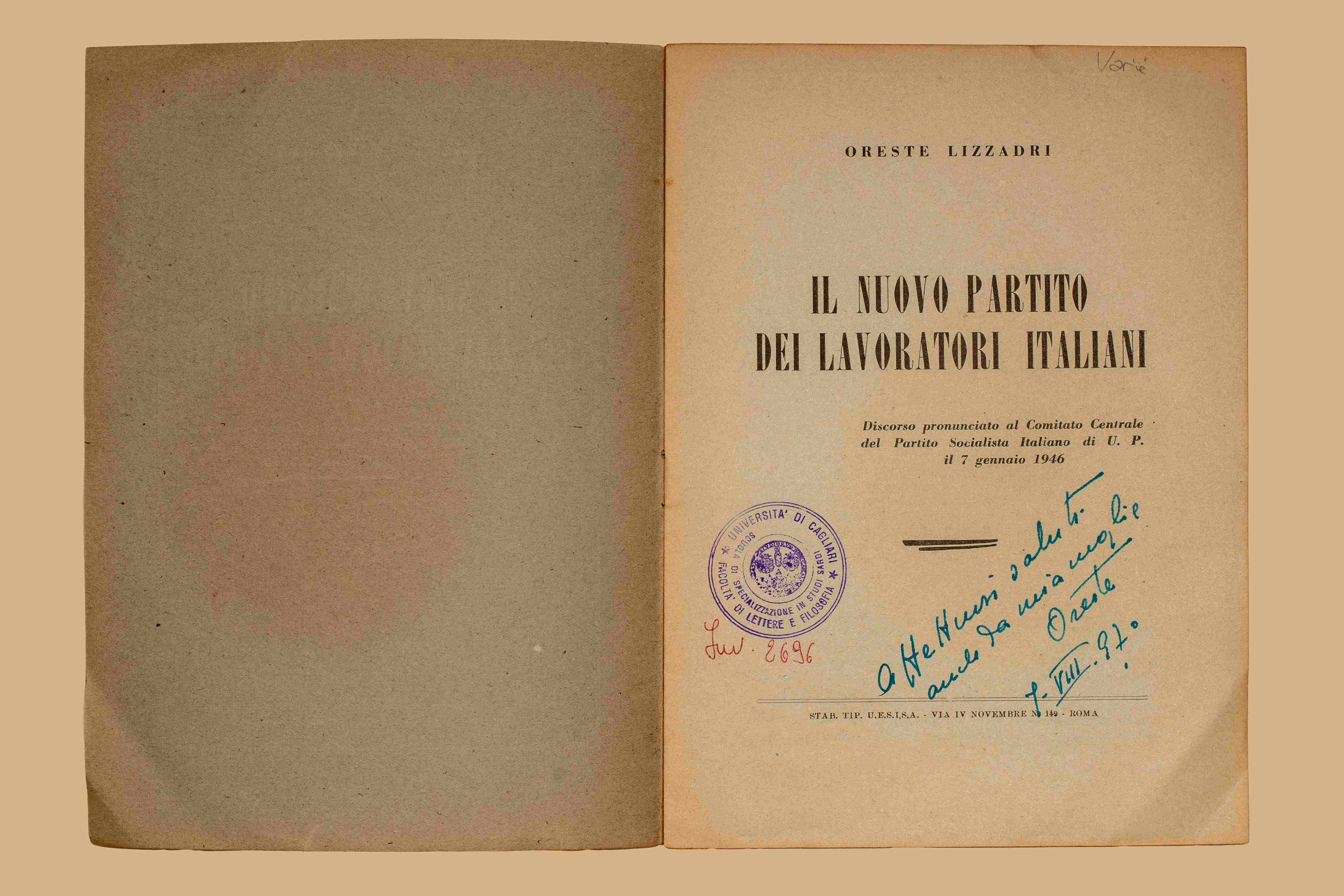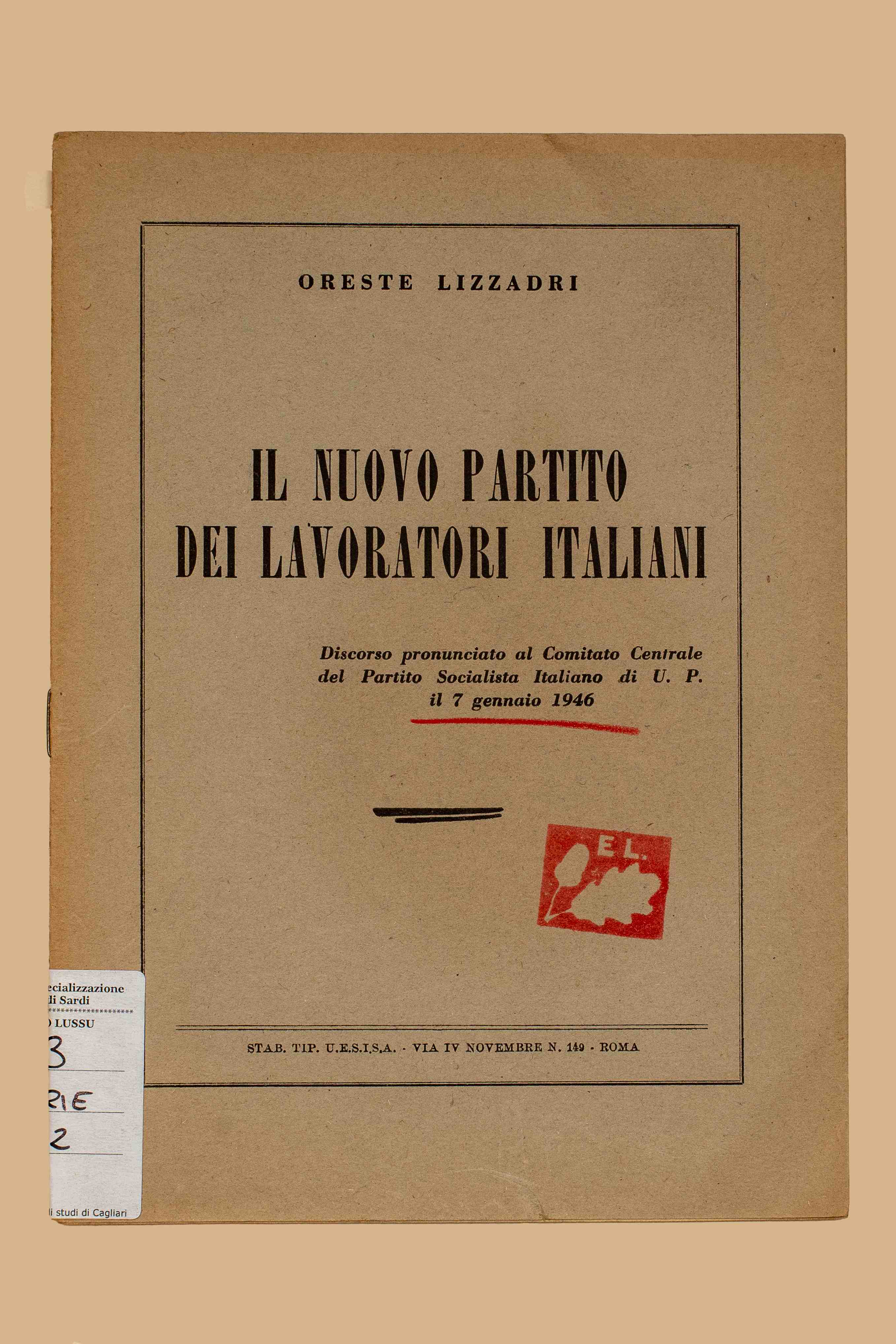- Il nuovo Partito dei lavoratori italiani : discorso pronunciato al Comitato centrale del Partito socialista italiano di UP il 7 gennaio 1946 / Oreste Lizzadri. - Roma : UESISA, [1946?]. - 12 p. ; 22 cm.
