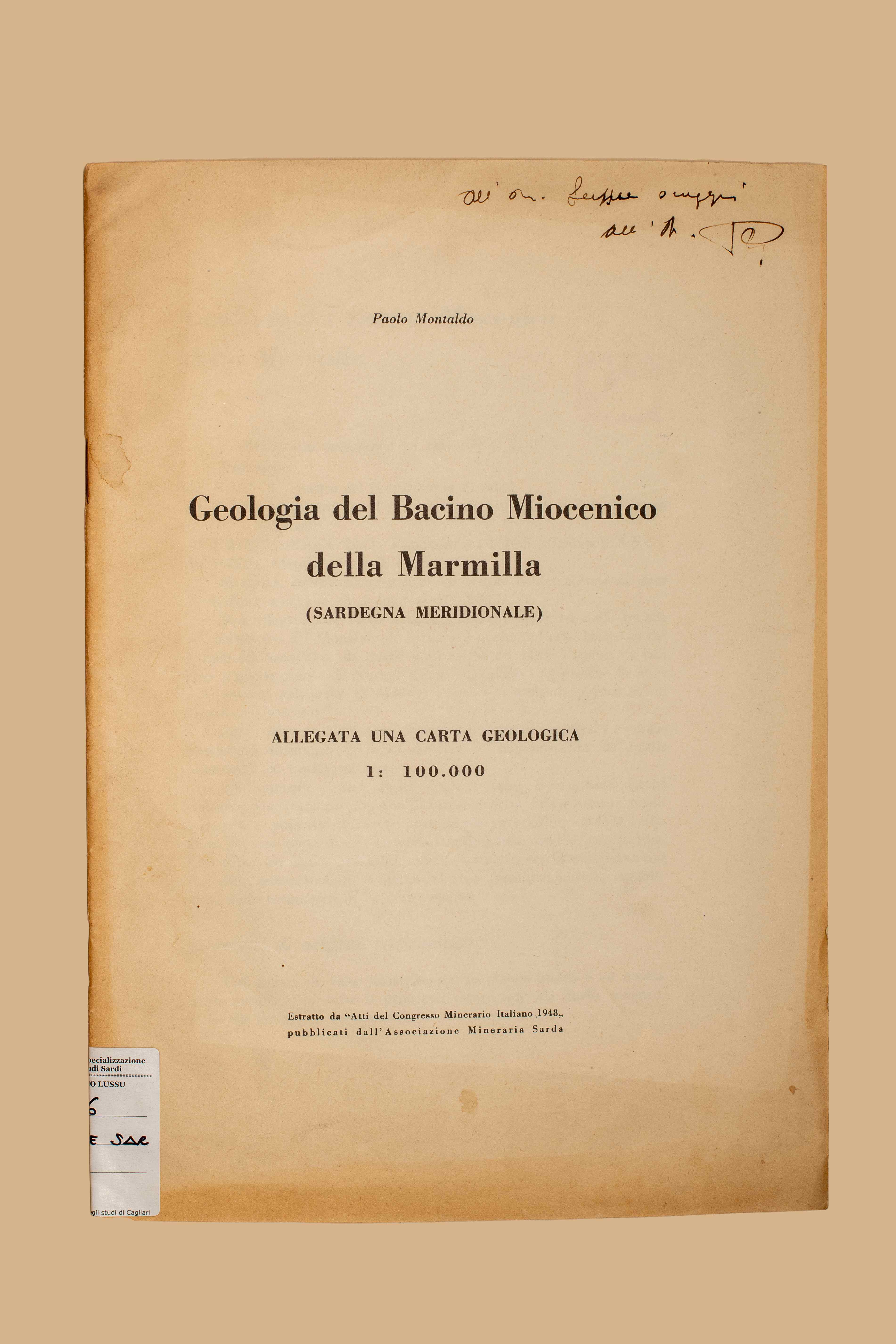 Titolo: Geologia del bacino miocenico della Marmilla (Sardegna meridionale) / Paolo Montaldo. - [S.l. : s.n., 1948?]. - 17 p. : ill. ; 30 cm + 1 c. geol. - Estr. da.: Atti del Congresso Minerario Italiano, 1948.