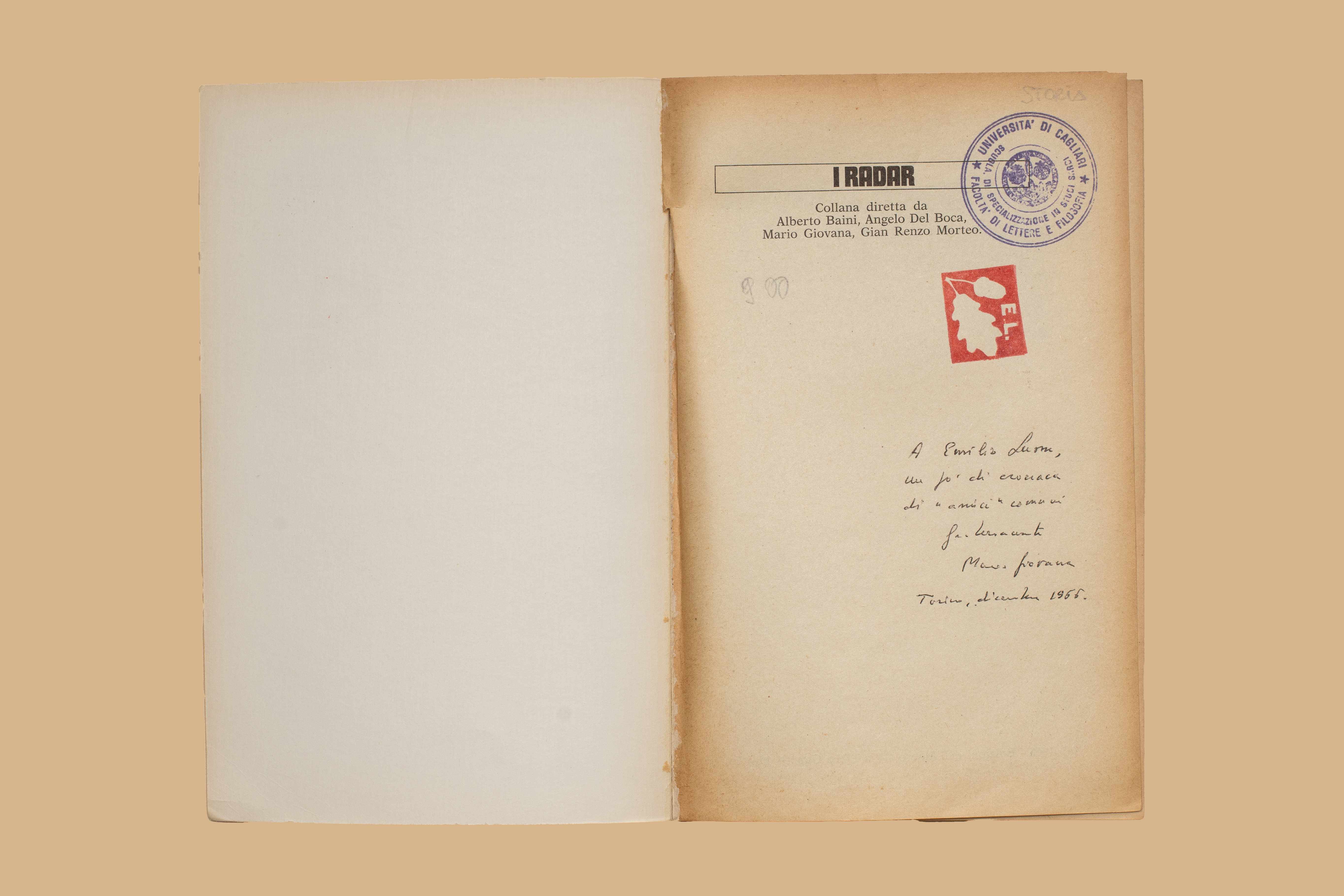 - Dedica dell’a. nell’occhietto: “A Emilio Lussu, un po’ di cronaca di “amici” comuni, Mario Giovana, Torino, dicembre 1966”.