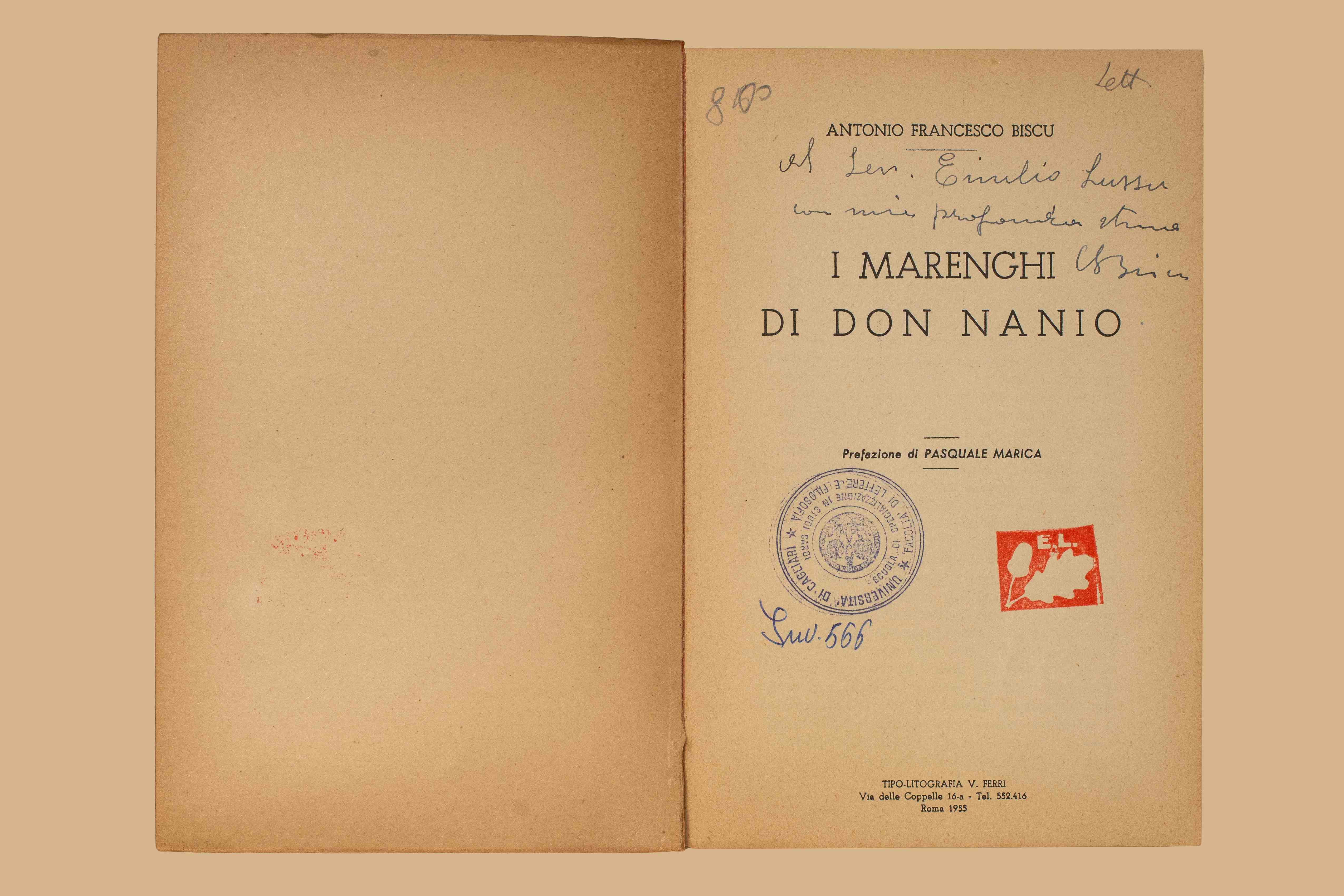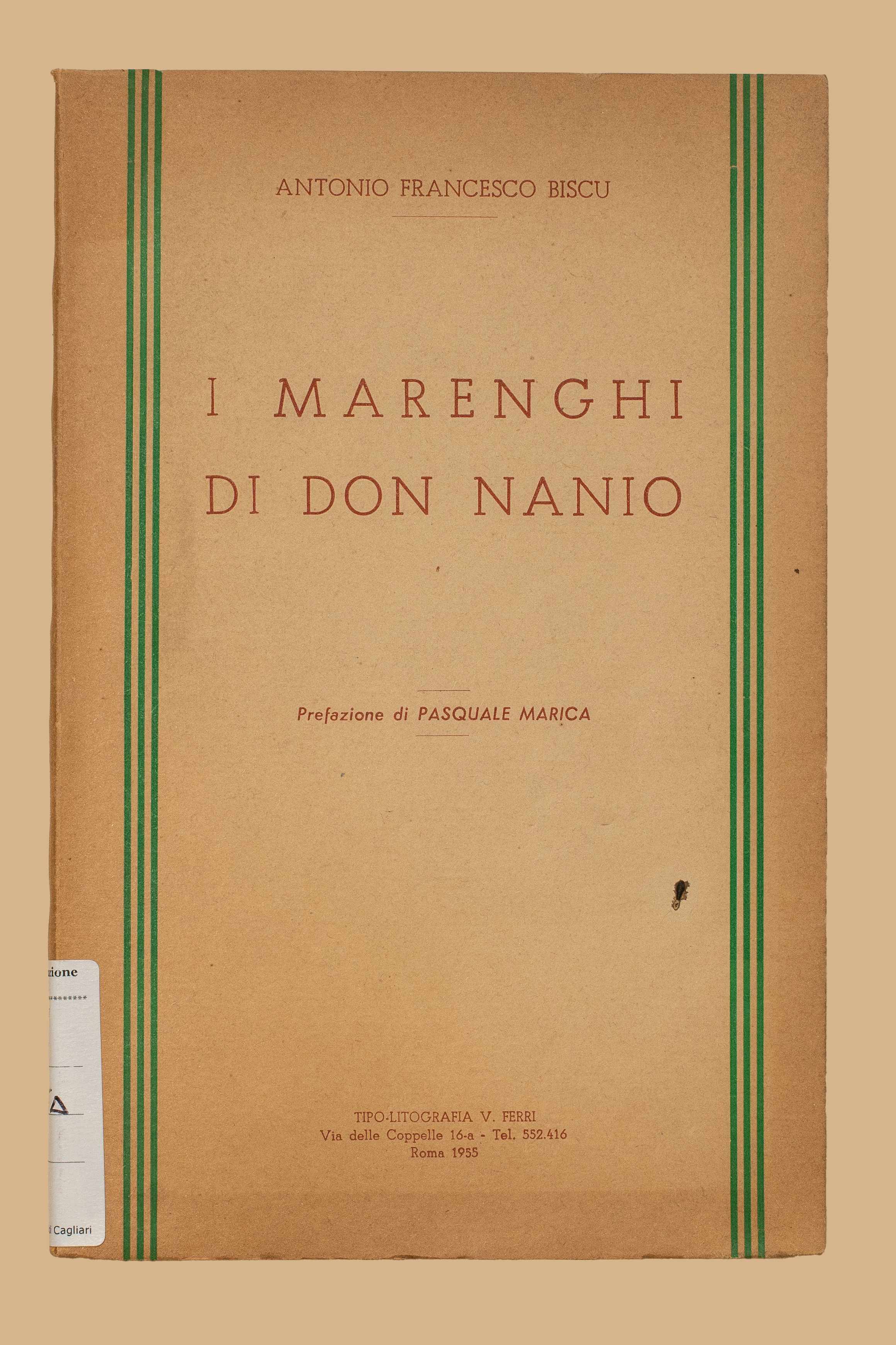 Titolo: I marenghi di don Nanio / Antonio Francesco Biscu ; prefazione di Pasquale Marica. - Roma : [s.n.], 1955 (Roma : Tipo-litogr. V. Ferri). - 252 p. ; 20 cm.