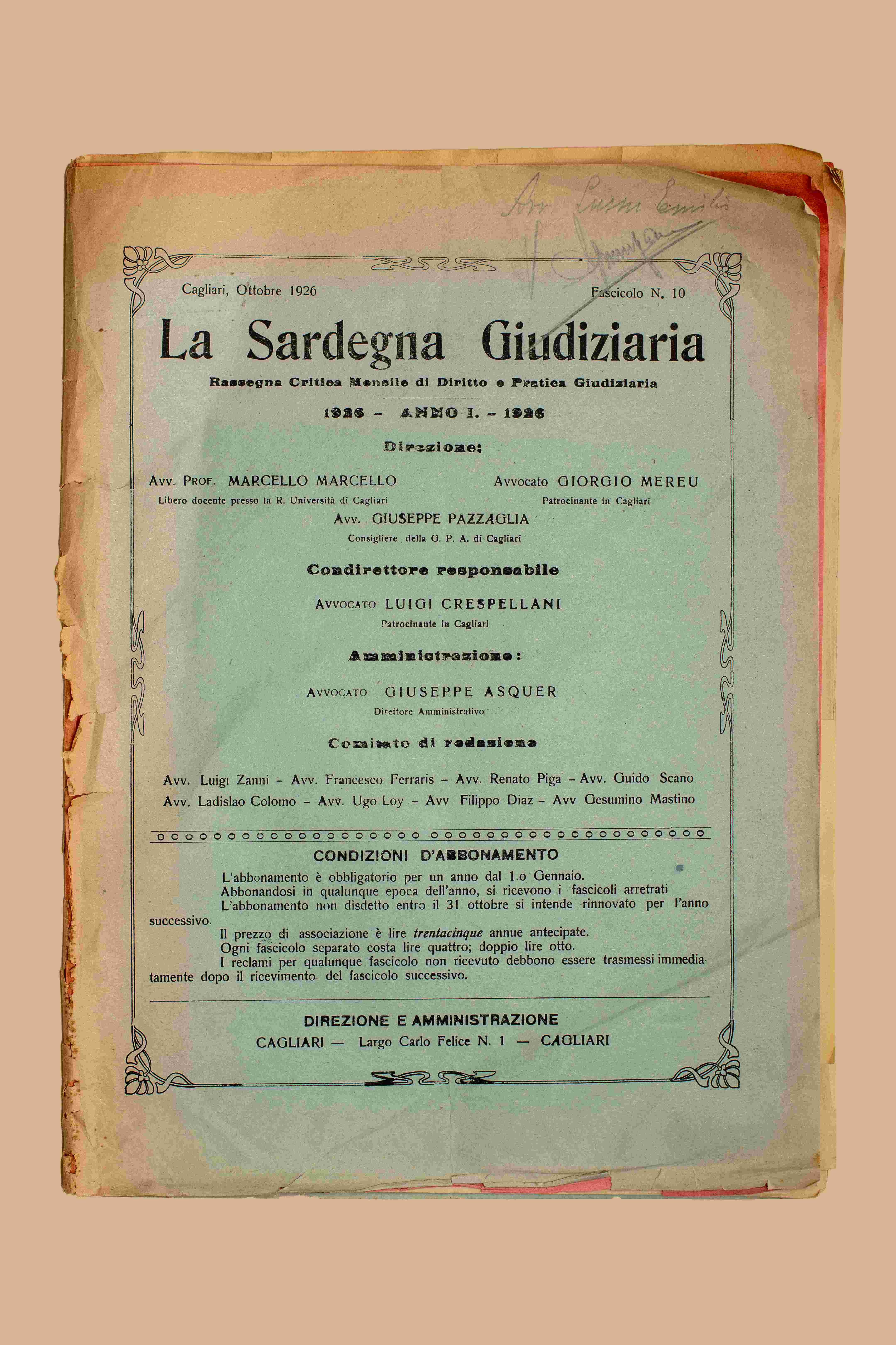 Note: Posseduto: 1926, n. 1-10. Nel fasc. 10 nota ms. “Avv. Lussu Emilio” seguita dal visto del carcere di Buoncammino.