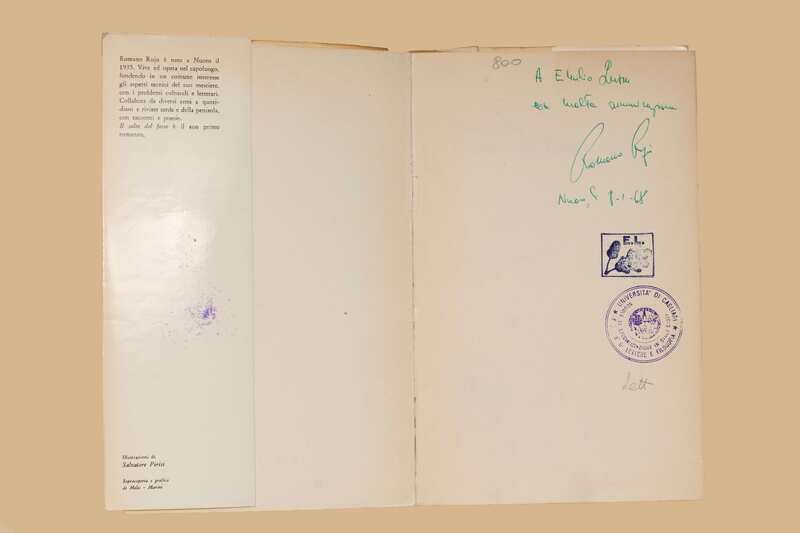 Note: Nel front. Dedica ms. dell'a. “A Emilio Lussu con molta ammirazione, Romano Ruju, Nuoro, 8.1.68”. Frammento della busta con cui è stato spedito il vol. con indirizzo del mittente e ms. “R. il 31.V.68”.