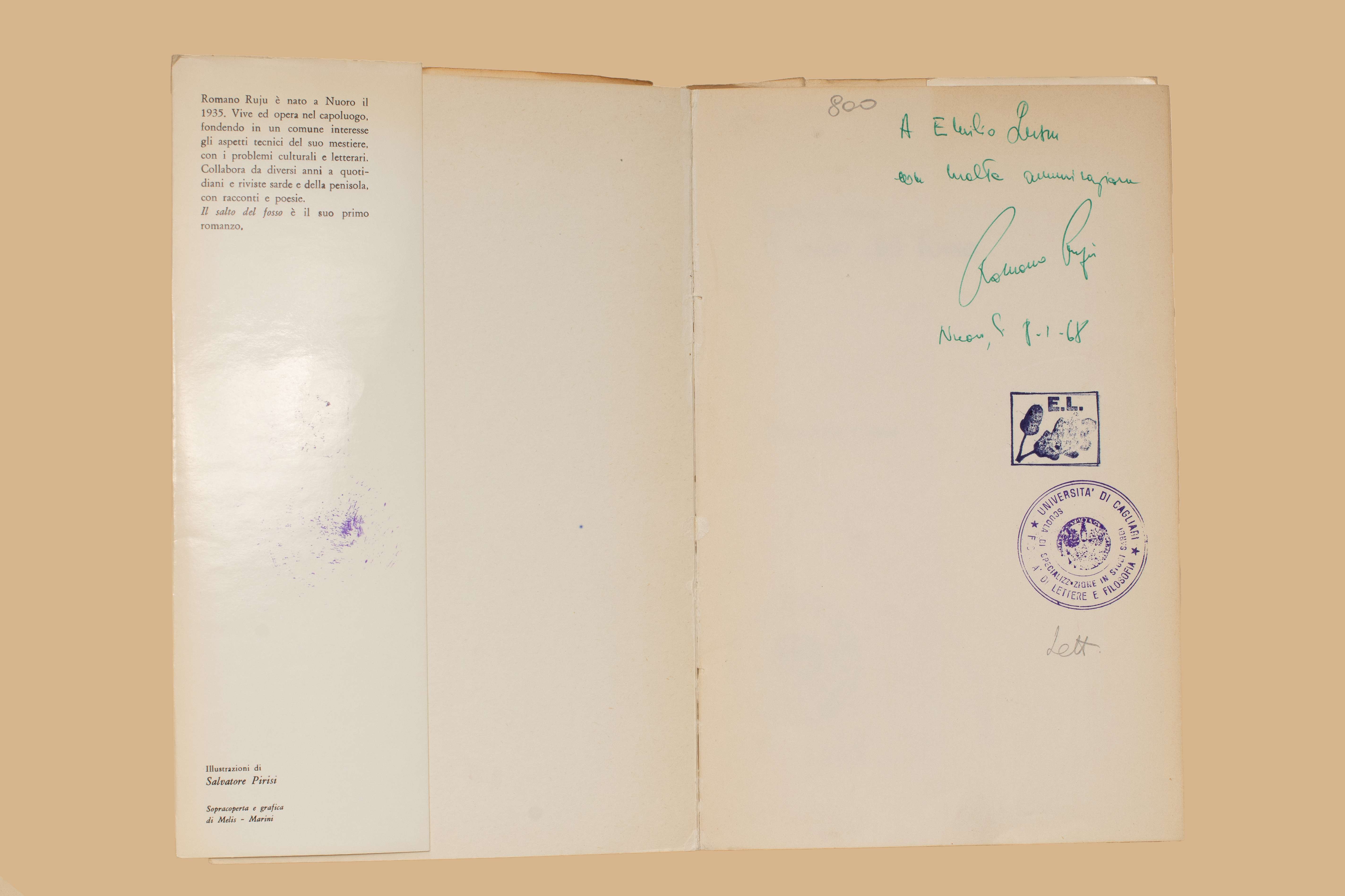 - Nel front. Dedica ms. dell'a. “A Emilio Lussu con molta ammirazione, Romano Ruju, Nuoro, 8.1.68”. Frammento della busta con cui è stato spedito il vol. con indirizzo del mittente e ms. “R. il 31.V.68”.