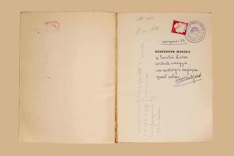 - Nell'occhietto dedica ms. dell'a.: Esemplare n. 77. A Emilio Lussu cordiale omaggio, con nostalgia angioyna ... Michele Saba; segue: “con preghiera di riscontro all'editore ing. Giorgio Sisini, corso Sempione 43 Milano”.