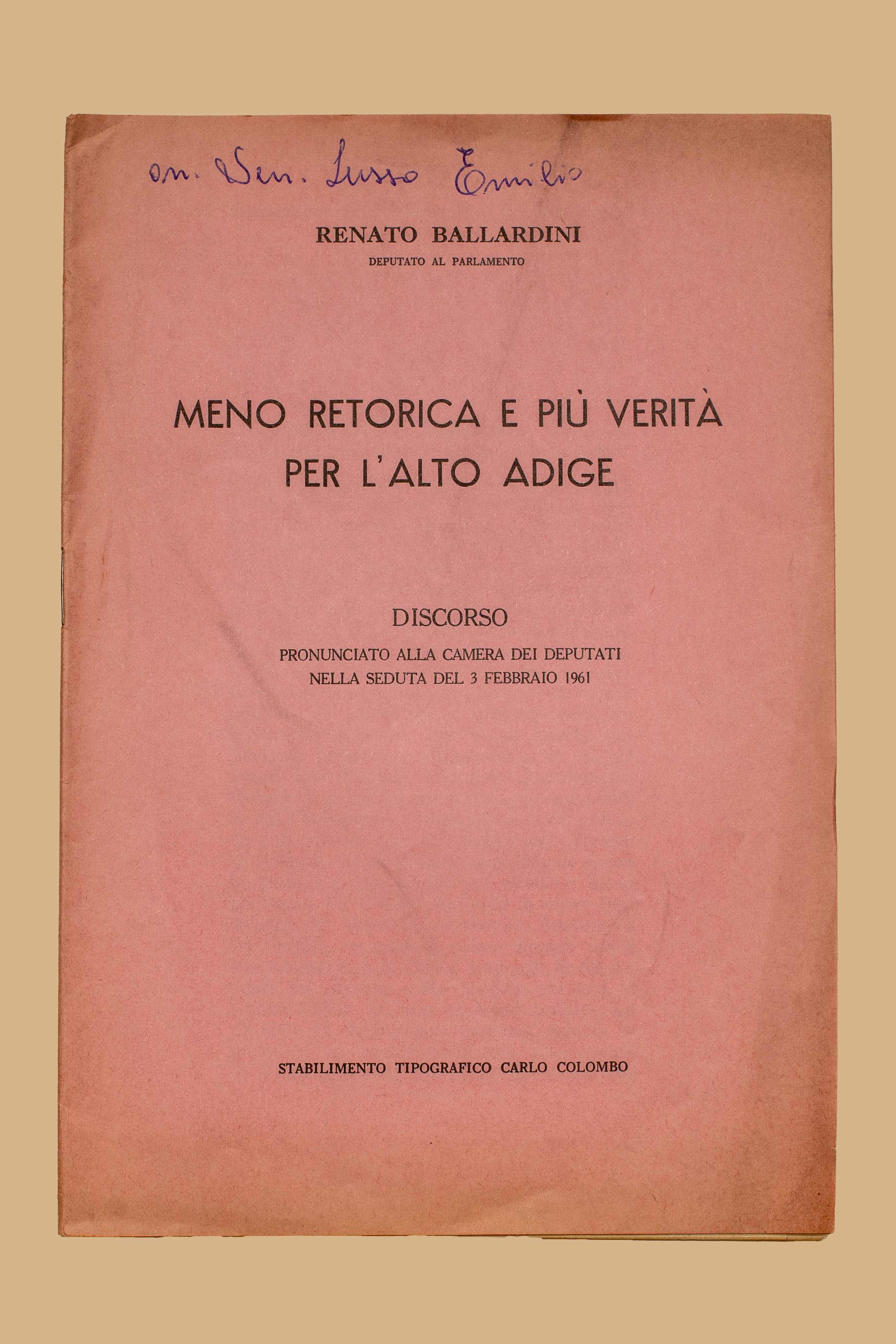 Titolo: Meno retorica e più verità per l’Alto Adige : discorso pronunciato alla Camera dei deputati nella seduta del 3 febbraio 1961 / Renato Ballardini. – Roma : Tip. C. Colombo, 1961. – 15 p. ; 21 cm.