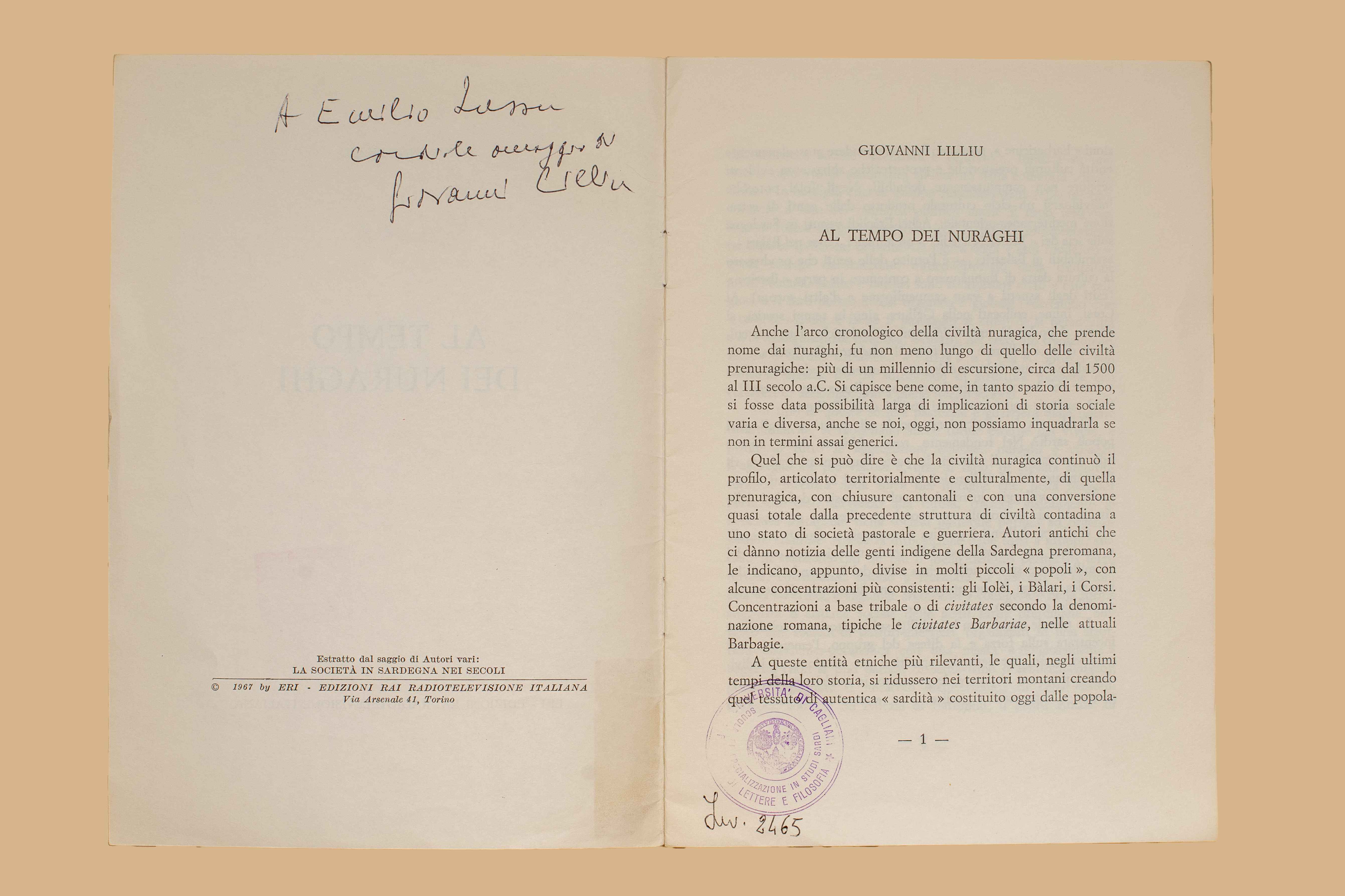 - Nel v. della cop. dedica ms. “A Emilio Lussu, cordiale omaggio di Giovanni Lilliu”.