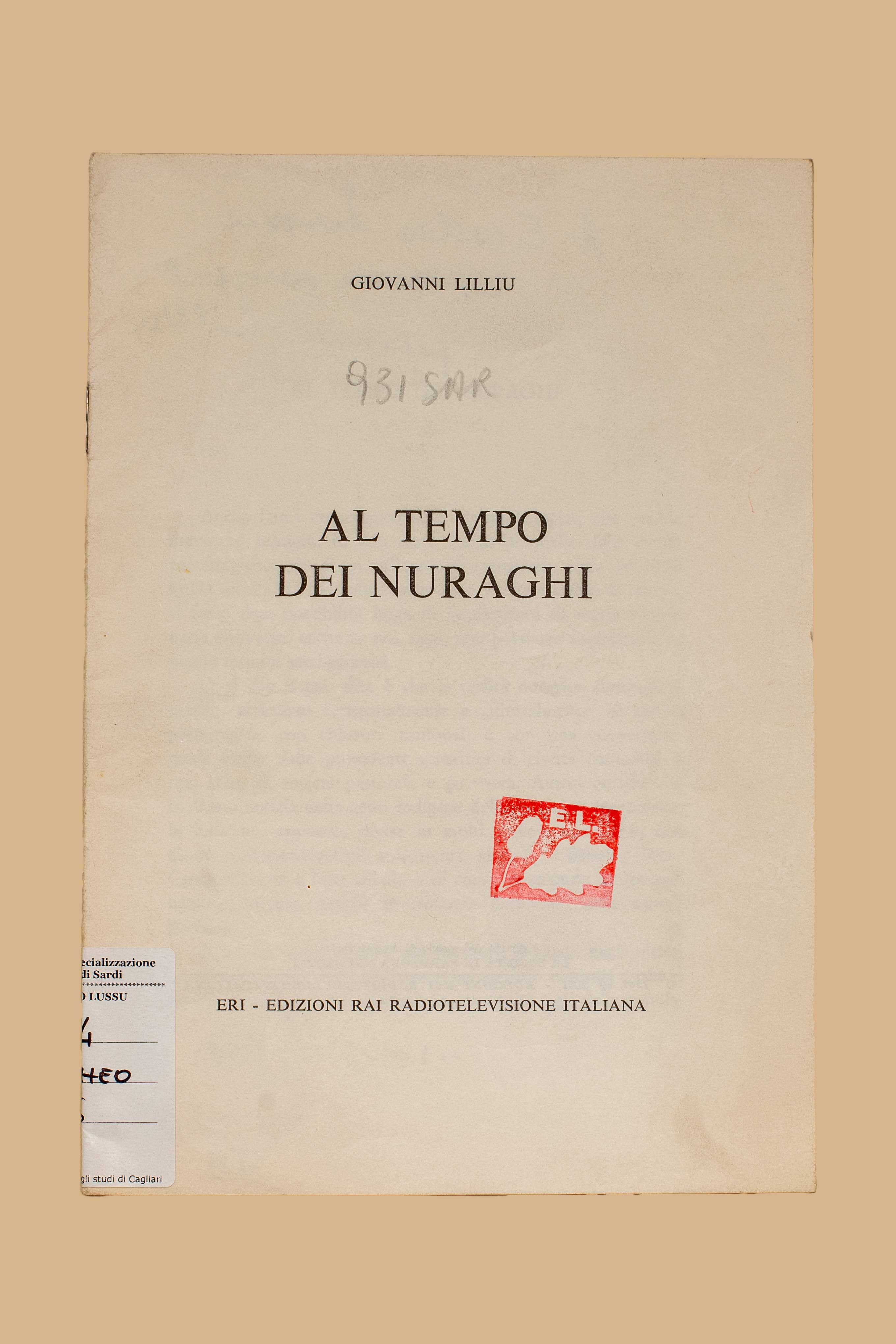 - Al tempo dei nuraghi / Giovanni Lilliu. - Torino : ERI, 1967. - 13 p. ; 22 cm. - Estr. da: La società in Sardegna nei secoli. - Torino : ERI.