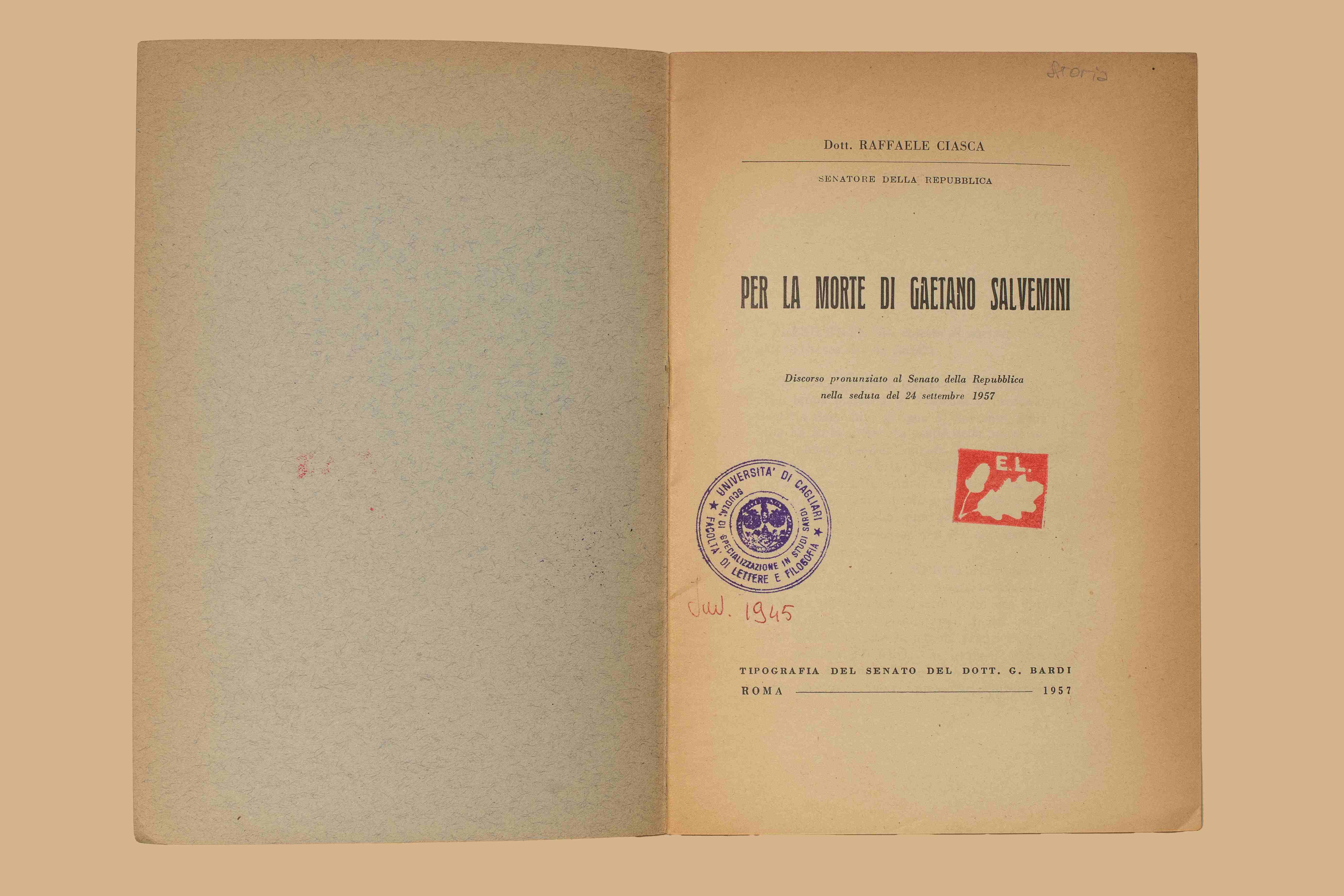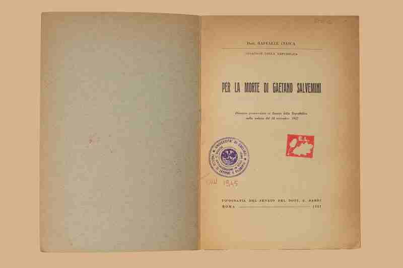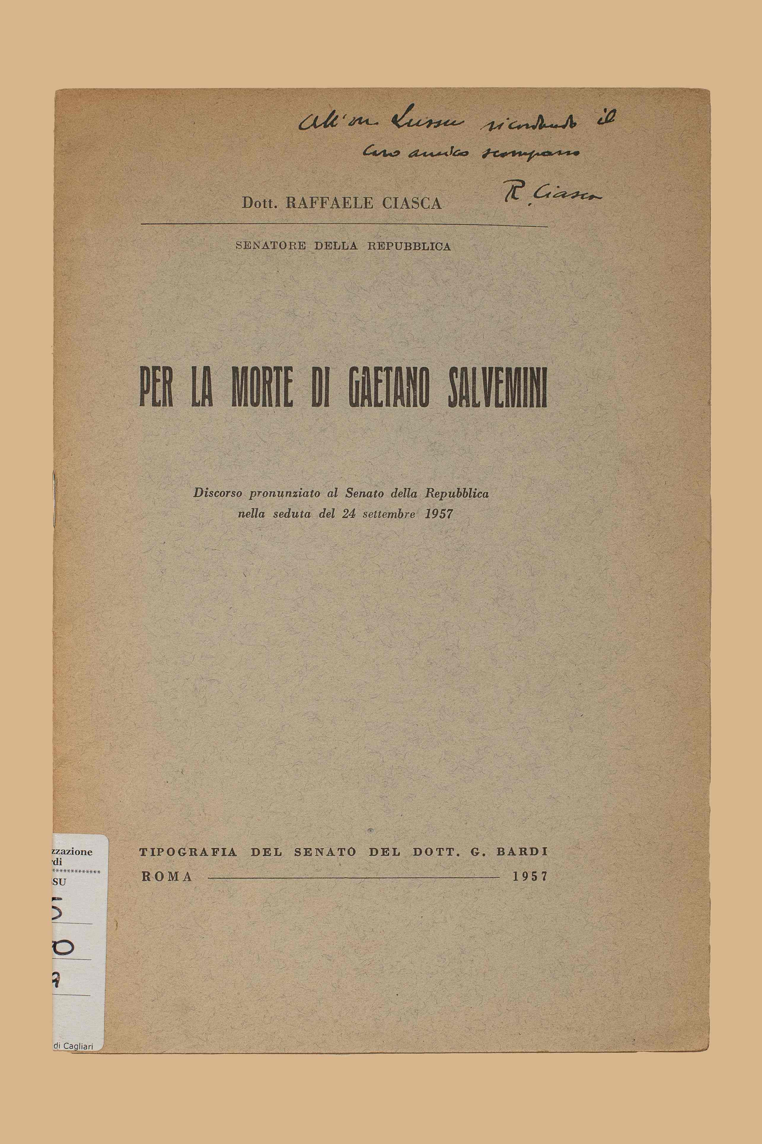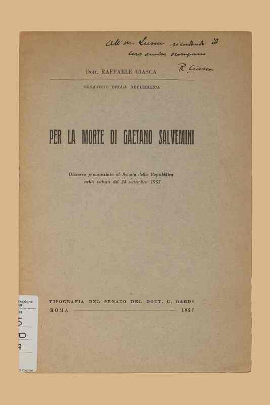 Titolo: Per la morte di Gaetano Salvemini : discorso pronunciato al Senato della Repubblica nella seduta del 24 settembre 1957 / Raffaele Ciasca. - Roma : tip. del Senato G. Bardi, 1957. - 19 p. ; 22 cm.