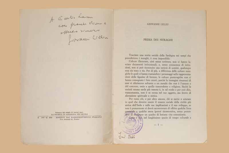 - Nel v. della cop. dedica ms. “A Emilio Lussu, con grande stima e affetto sincero, Giovanni Lilliu”.