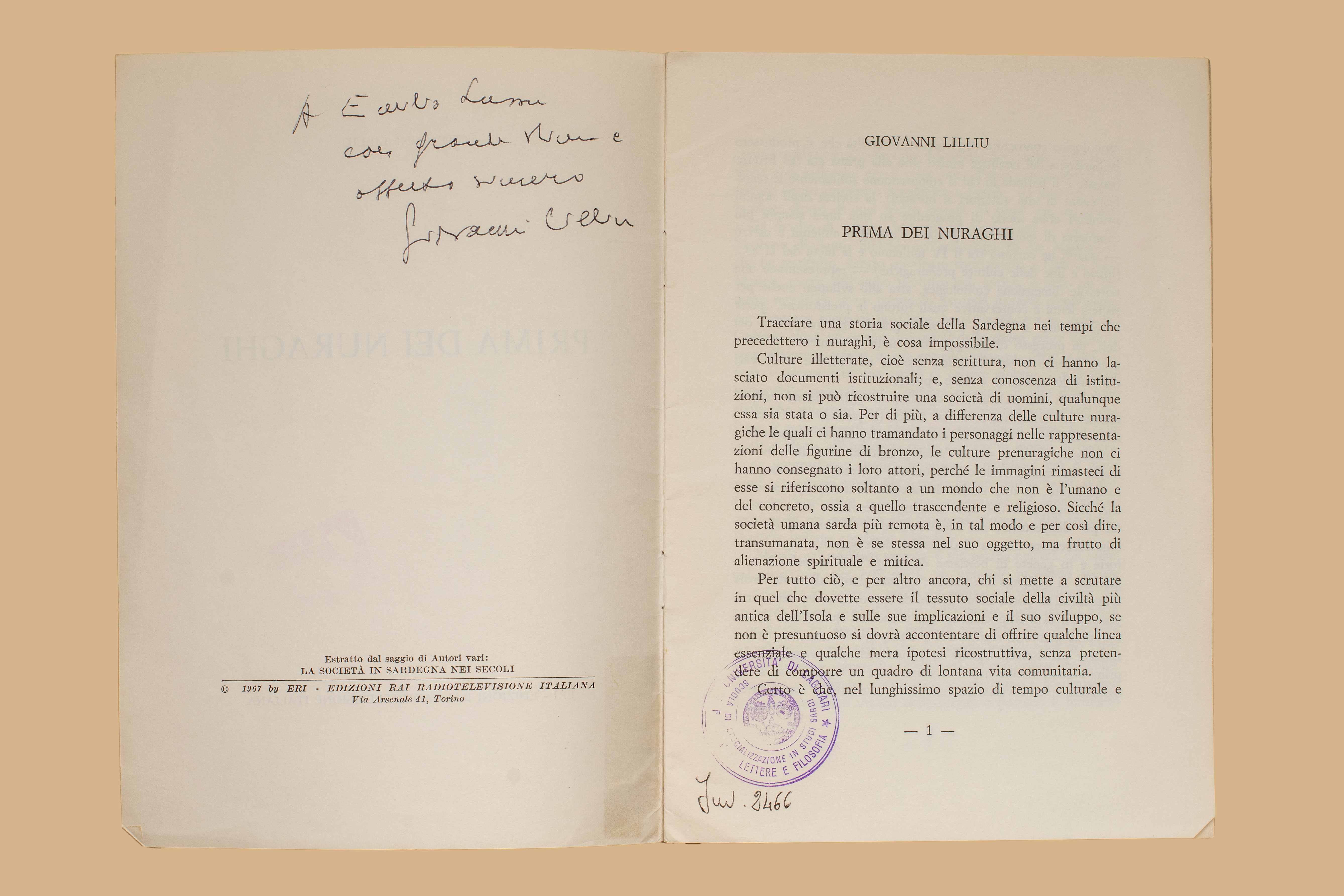 Note: Nel v. della cop. dedica ms. “A Emilio Lussu, con grande stima e affetto sincero, Giovanni Lilliu”.