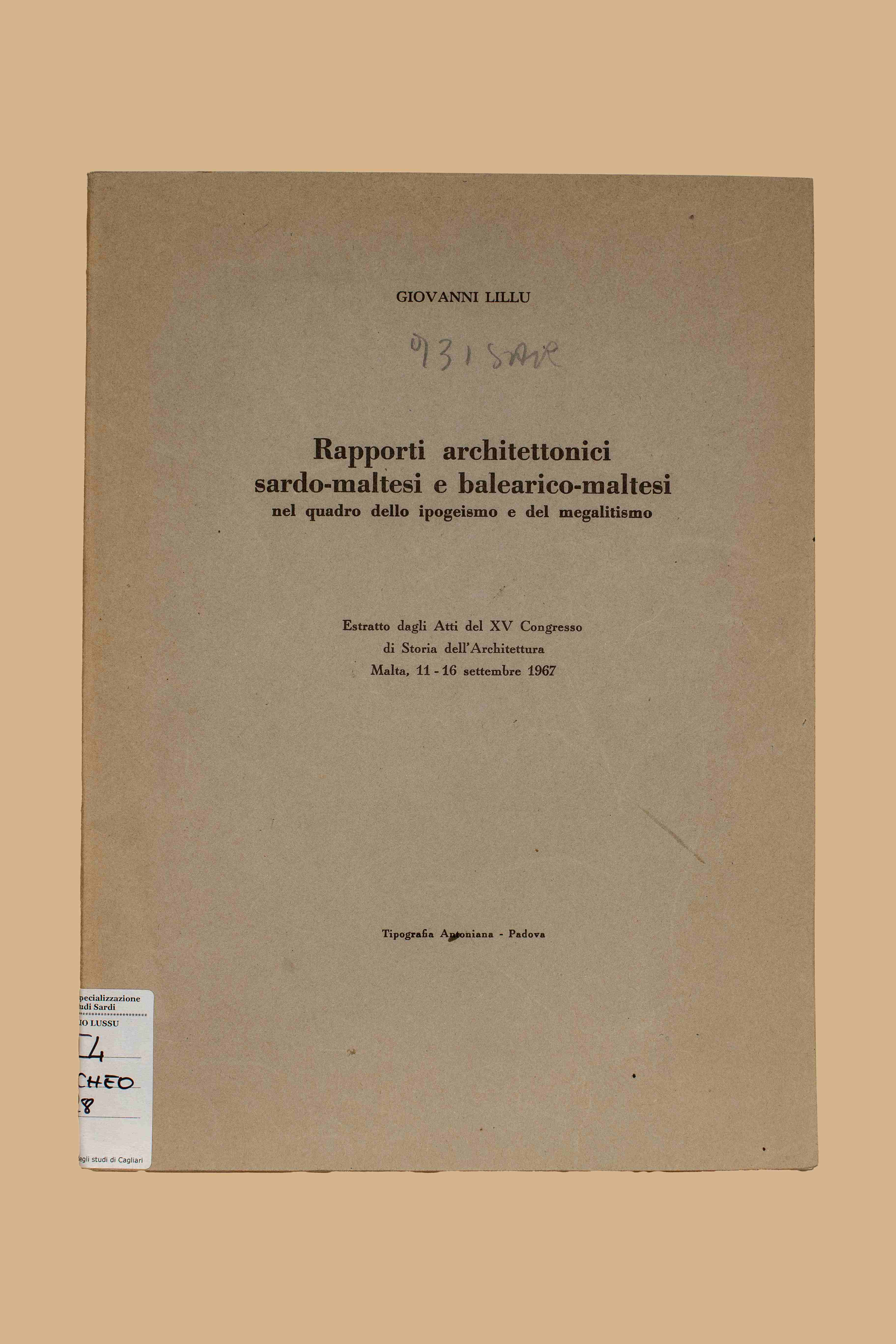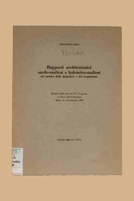 Titolo: Rapporti architettonici sardo-maltesi e balearico-maltesi nel quadro dello ipogeismo e del megalitismo / Giovanni Lilliu. - Padova : Tip. Antoniana, [1967?]. - P. 100-172 : ill. ; 27 cm. - Estr. da: Atti del 15. Congresso di Storia dell'Architettura, Malta, 11-16 settembre 1967.