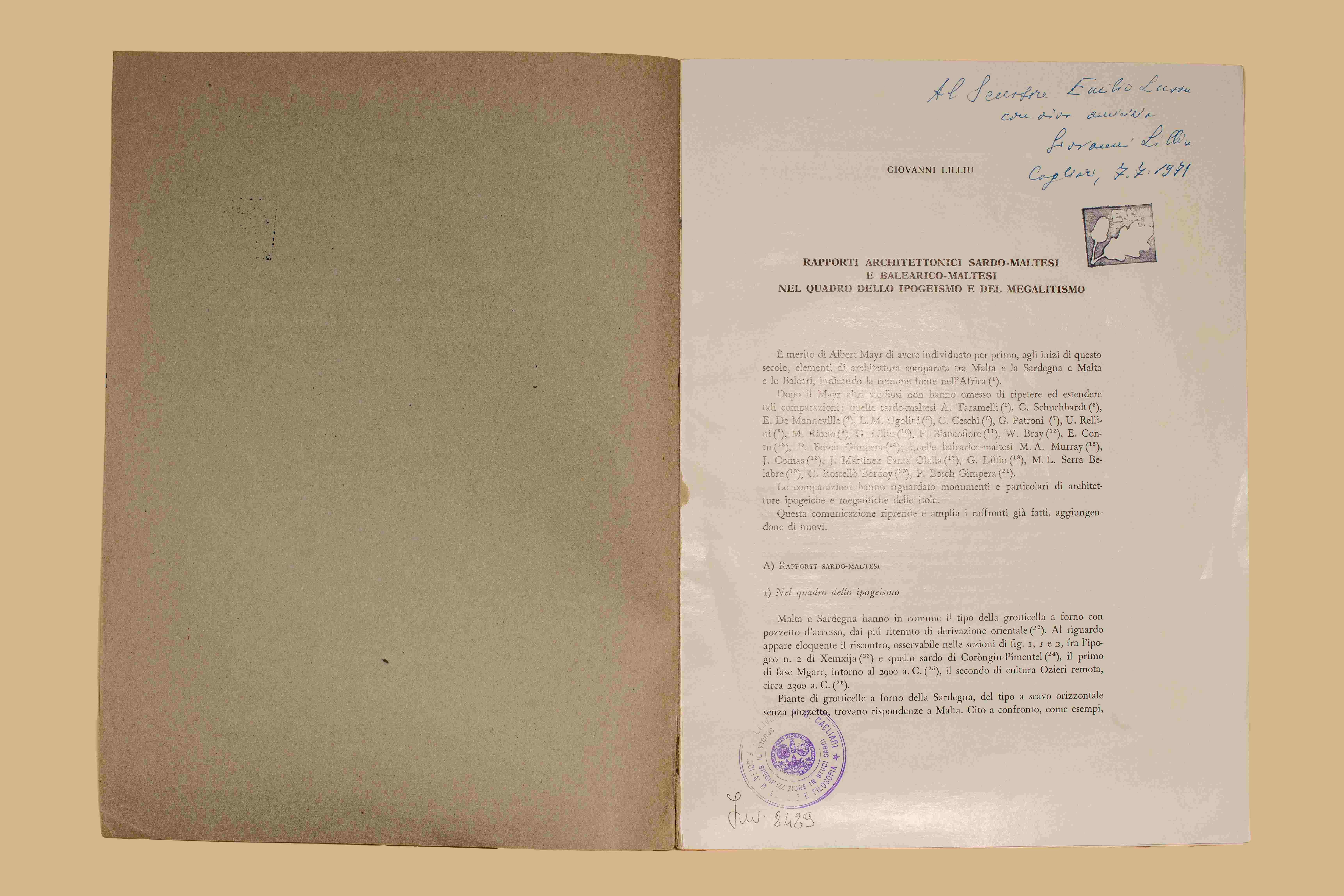 Note: Dedica ms. dell'a. nella p. iniziale “Al Senatore Emilio Lussu con viva amicizia, GiovannI Lilliu. Cagliari 7.7.1971”.