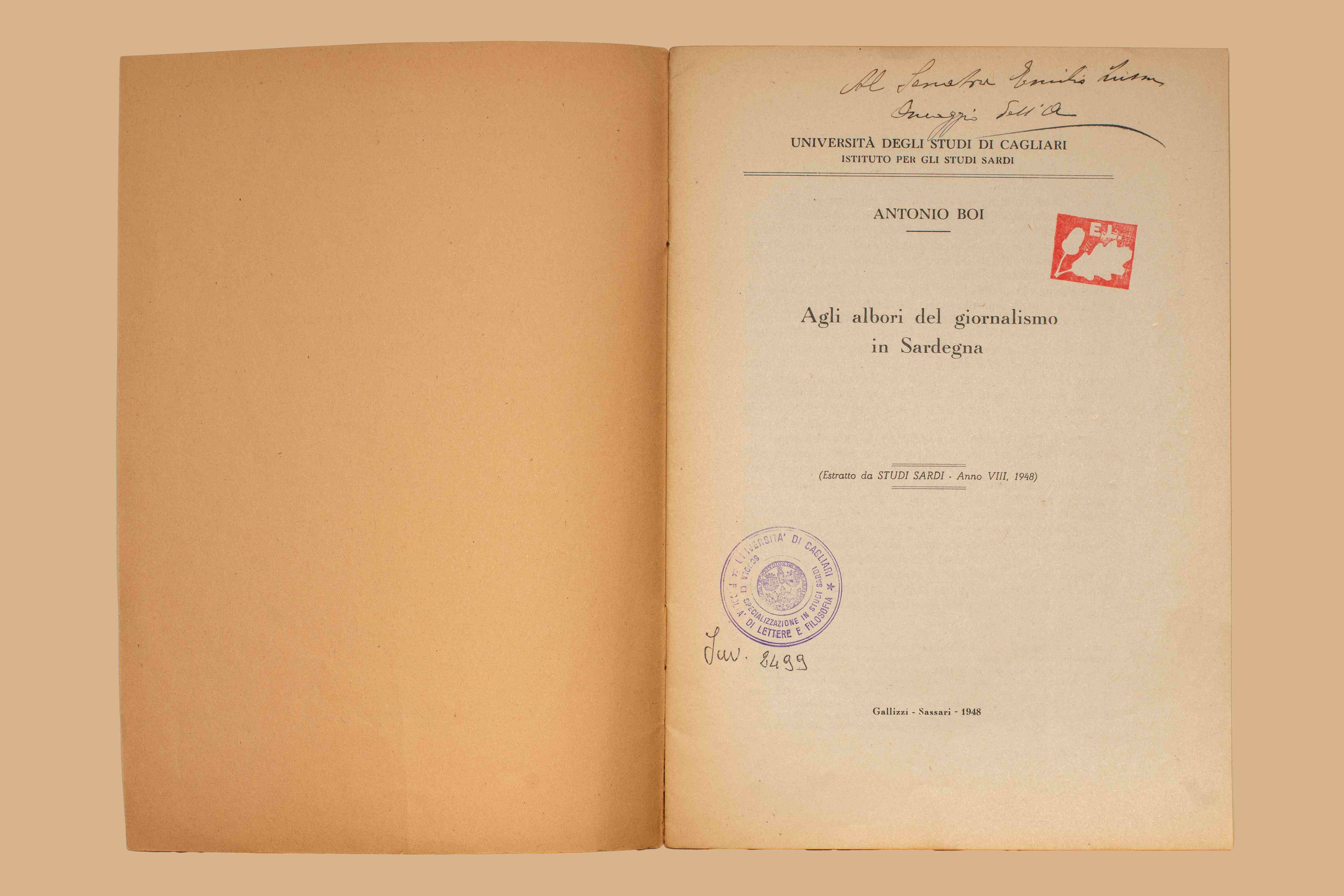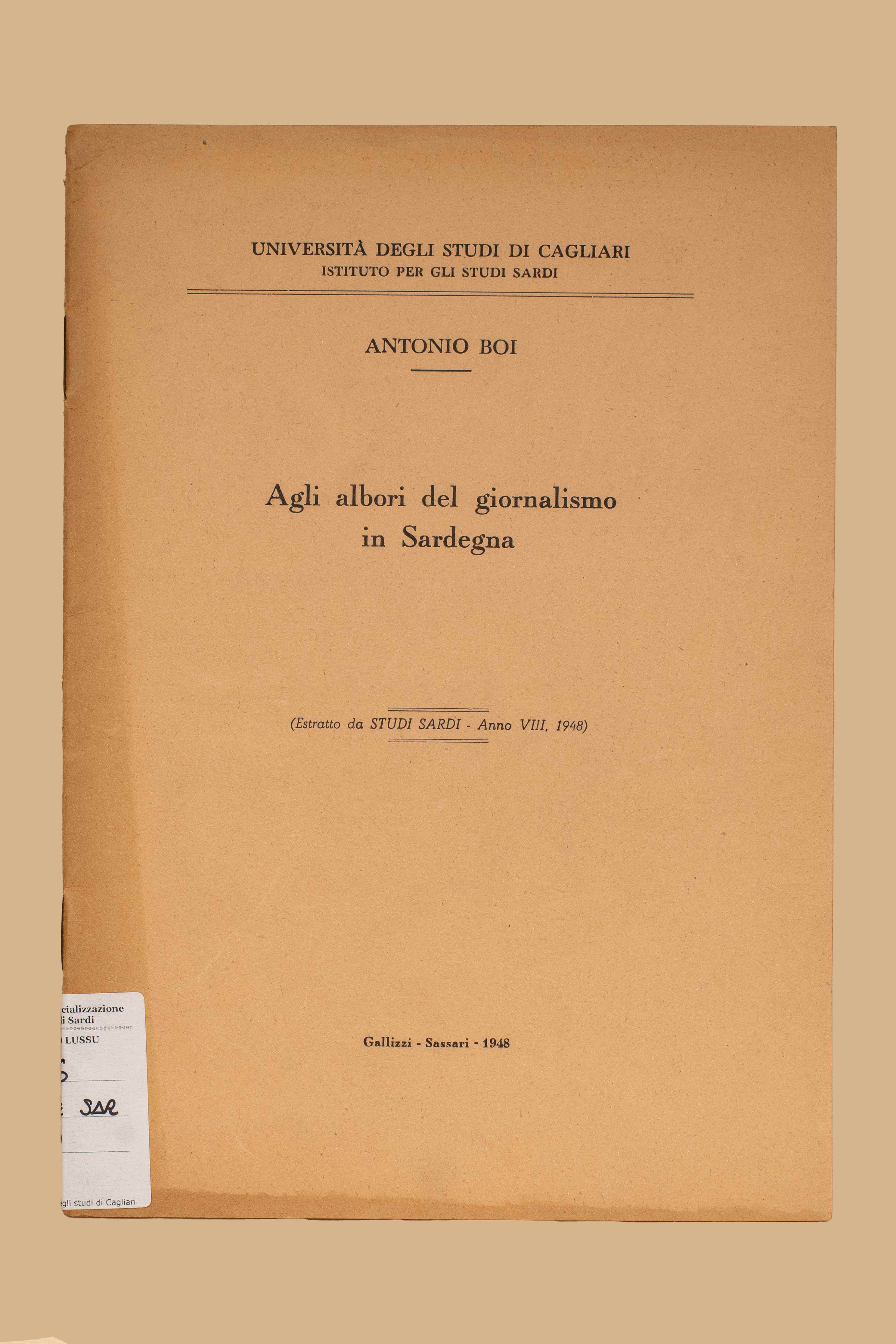 - Agli albori del giornalismo in Sardegna / Antonio Boi. - Sassari : Gallizzi, 1948. - 23 p. ; 25 cm. - In testa al front.: Università degli Studi di Cagliari, Istituto per gli Studi Sardi. - Estr. da: Studi Sardi, anno 8., 1948.