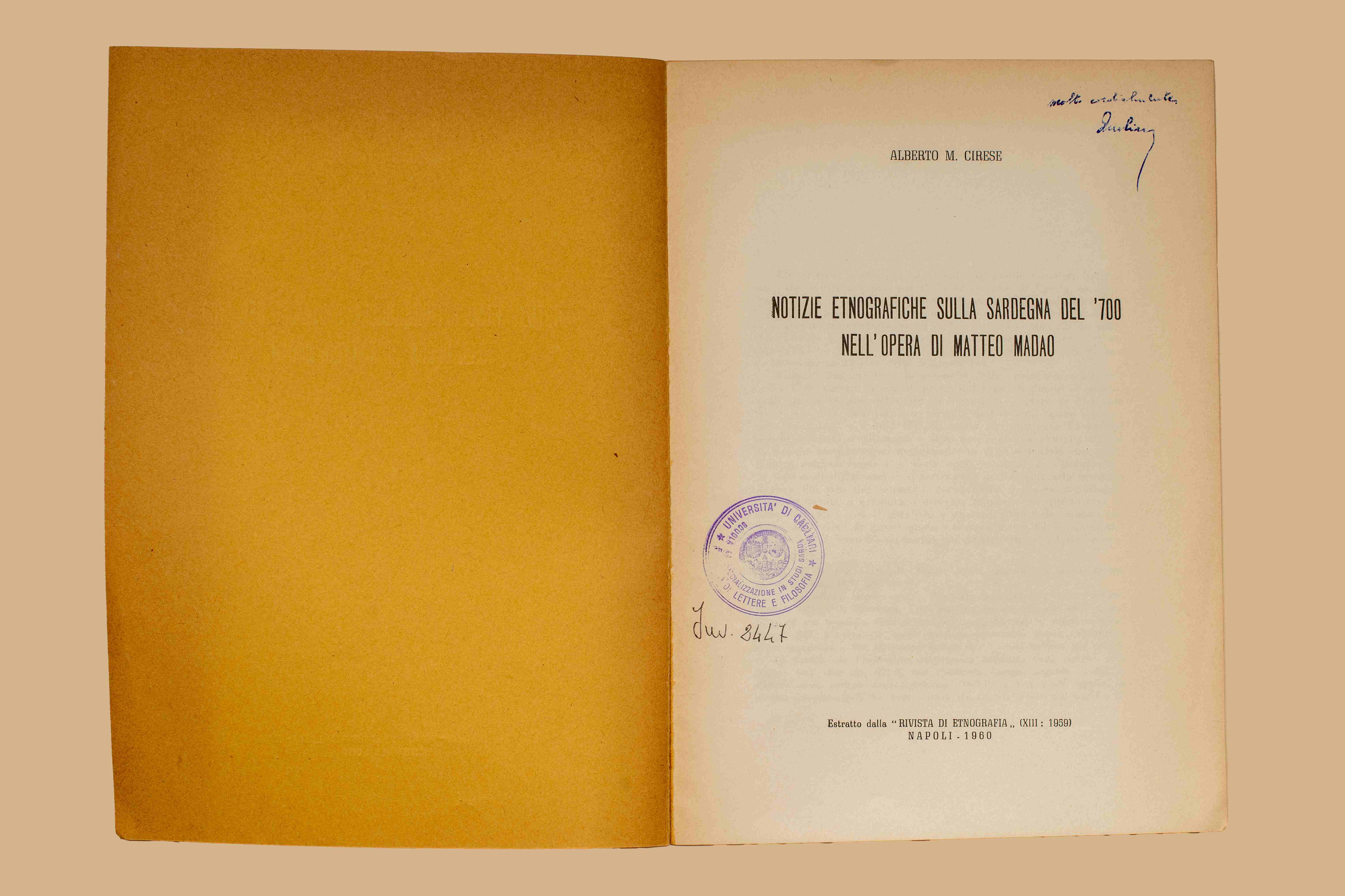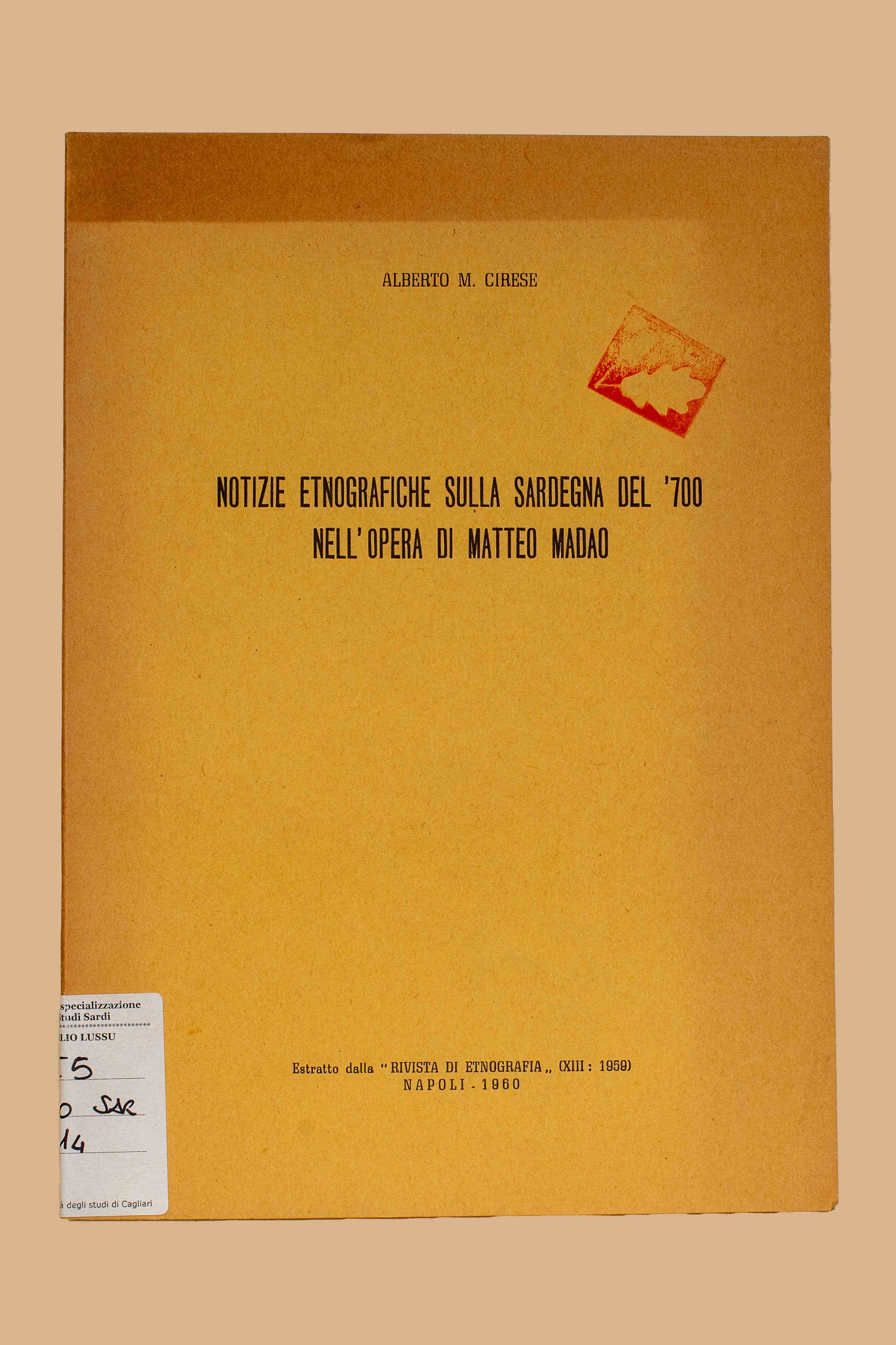 Titolo: Notizie etnografiche sulla Sardegna del '700 nell'opera di Matteo Madao / Alberto M. Cirese. - Napoli : [s.n.], 1960. - 35 p. ; 24 cm. - ((Estr. da: Rivista di etnografia, 13.(1959).