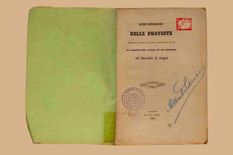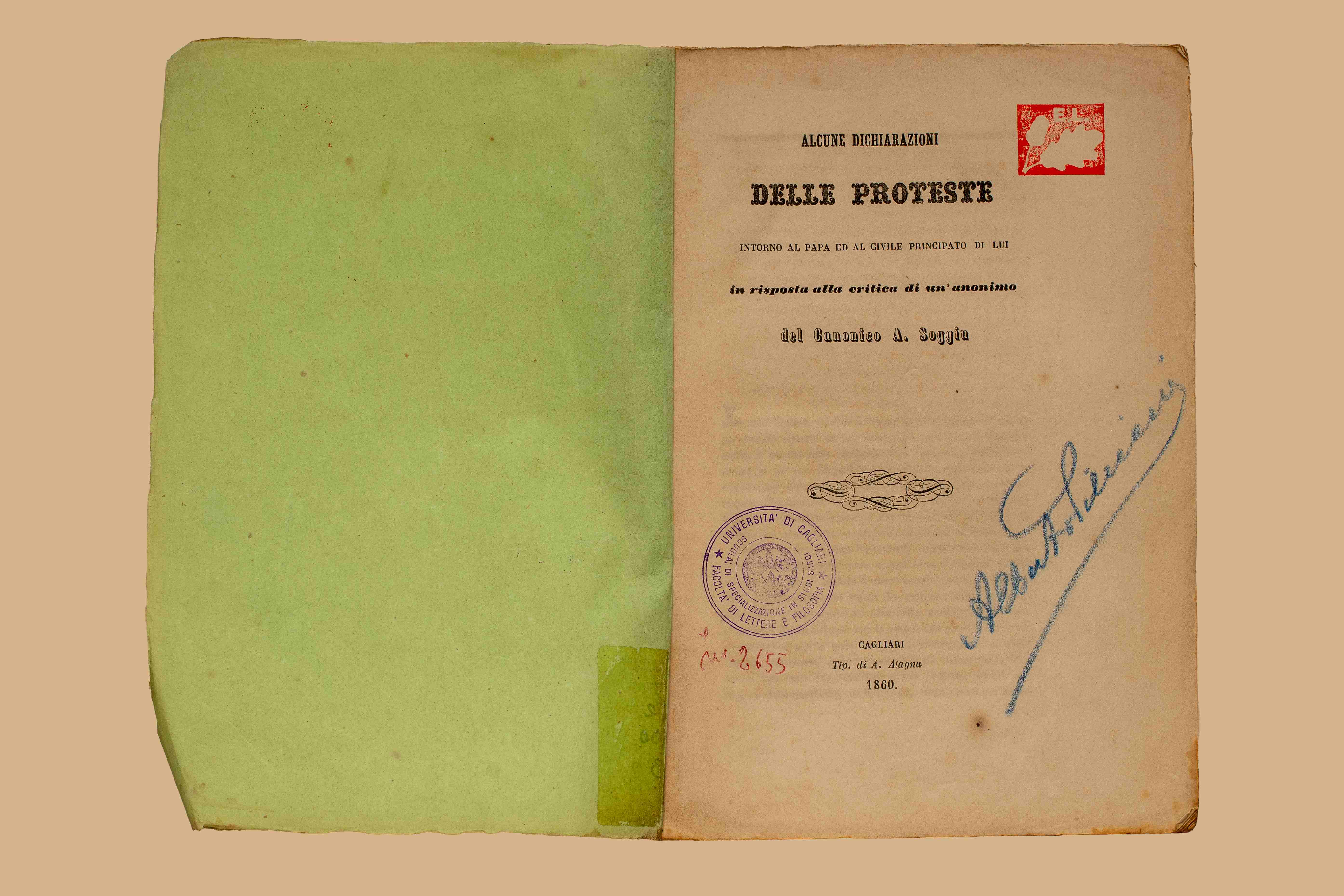 Titolo: Alcune dichiarazioni delle proteste intorno al Papa ed al civile principato di lui in risposta alla critica di un'anonimo / del canonico A. Soggiu. - Cagliari : Tip. di A. Alagna, 1860. - 70 p. ; 22 cm.