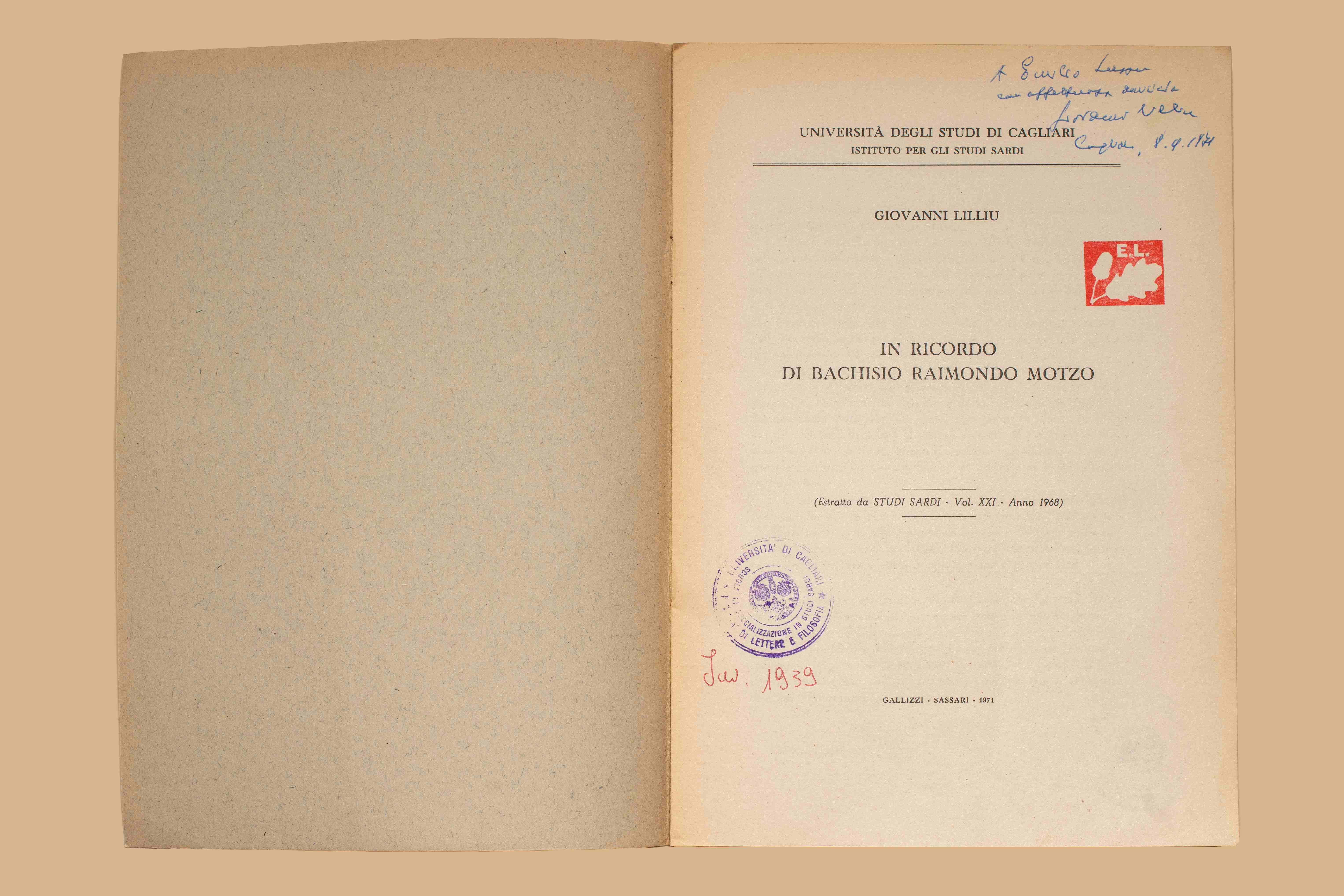 - Nel front. dedica ms. dell'a. “A Emilio Lussu, con affettuosa amicizia, Giovanni Lilliu, Cagliari, 8.9.1971”.