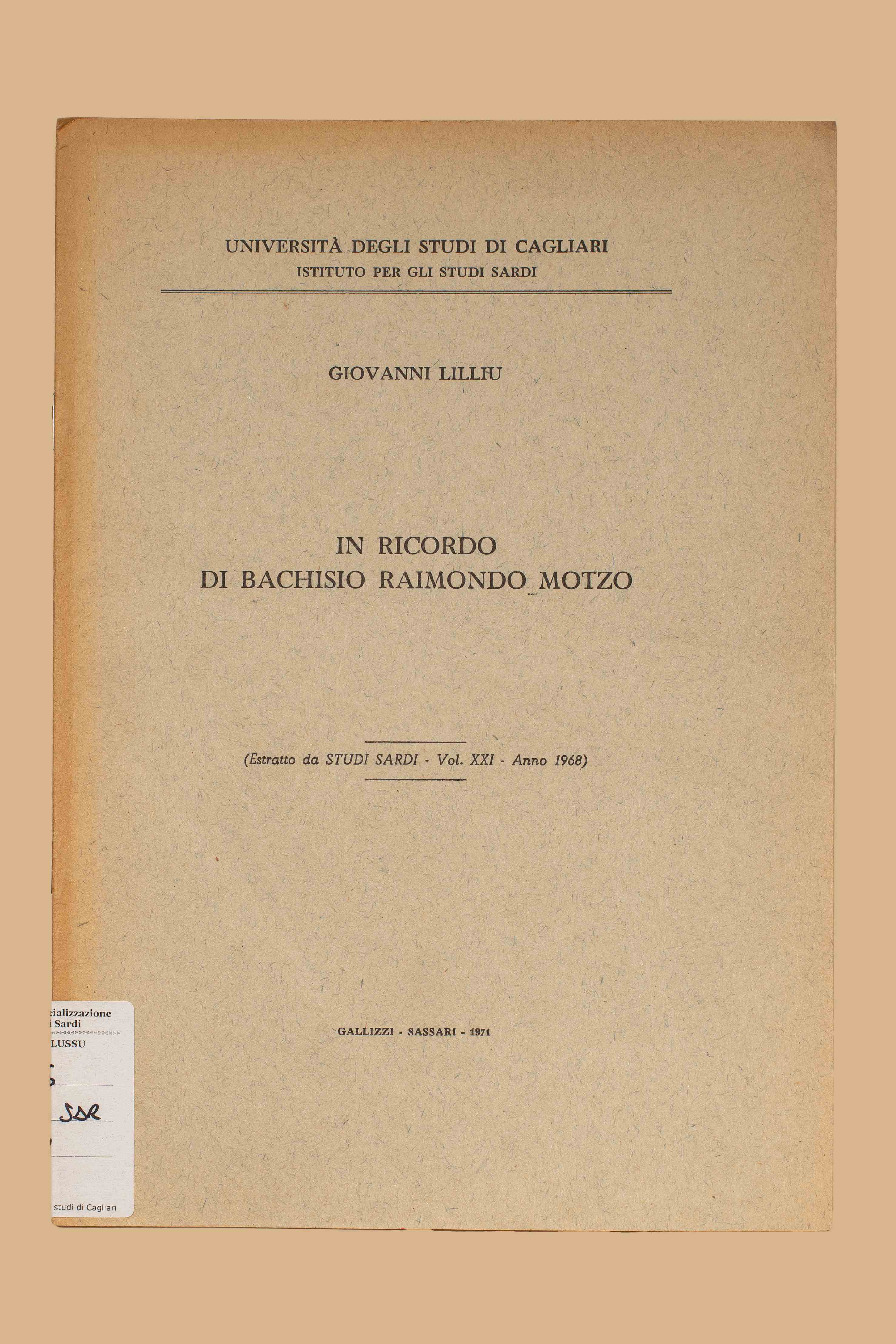 - In ricordo di Bachisio Raimondo Motzo / Giovanni Lilliu. - Sassari : Gallizzi, 1971. - 6 p. ; 25 cm. - In testa al front.: Università degli Studi di Cagliari, Istituto per gli studi sardi. - Estr. da: Studi sardi, vol. XXI, a. 1968.