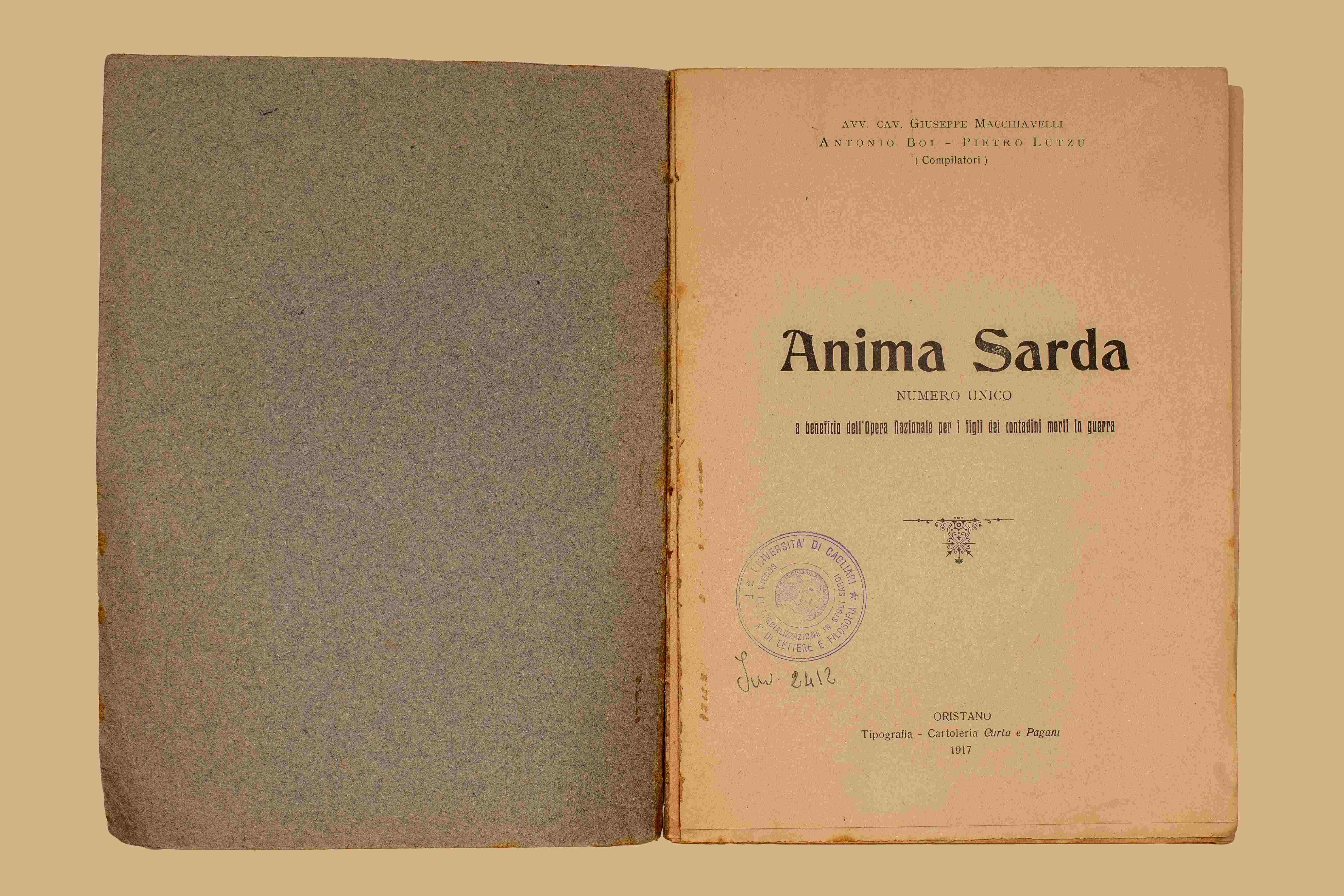 - Anima sarda : numero unico a beneficio dell'Opera Nazionale per i figli dei contadini morti in guerra / [a cura di] Giuseppe Macchiavelli, Antonio Boi, Pietro Lutzu. - Oristano ; Tipografia-Cartoleria Carta e Paganu, 1917. - 131 p. ; 23 cm.