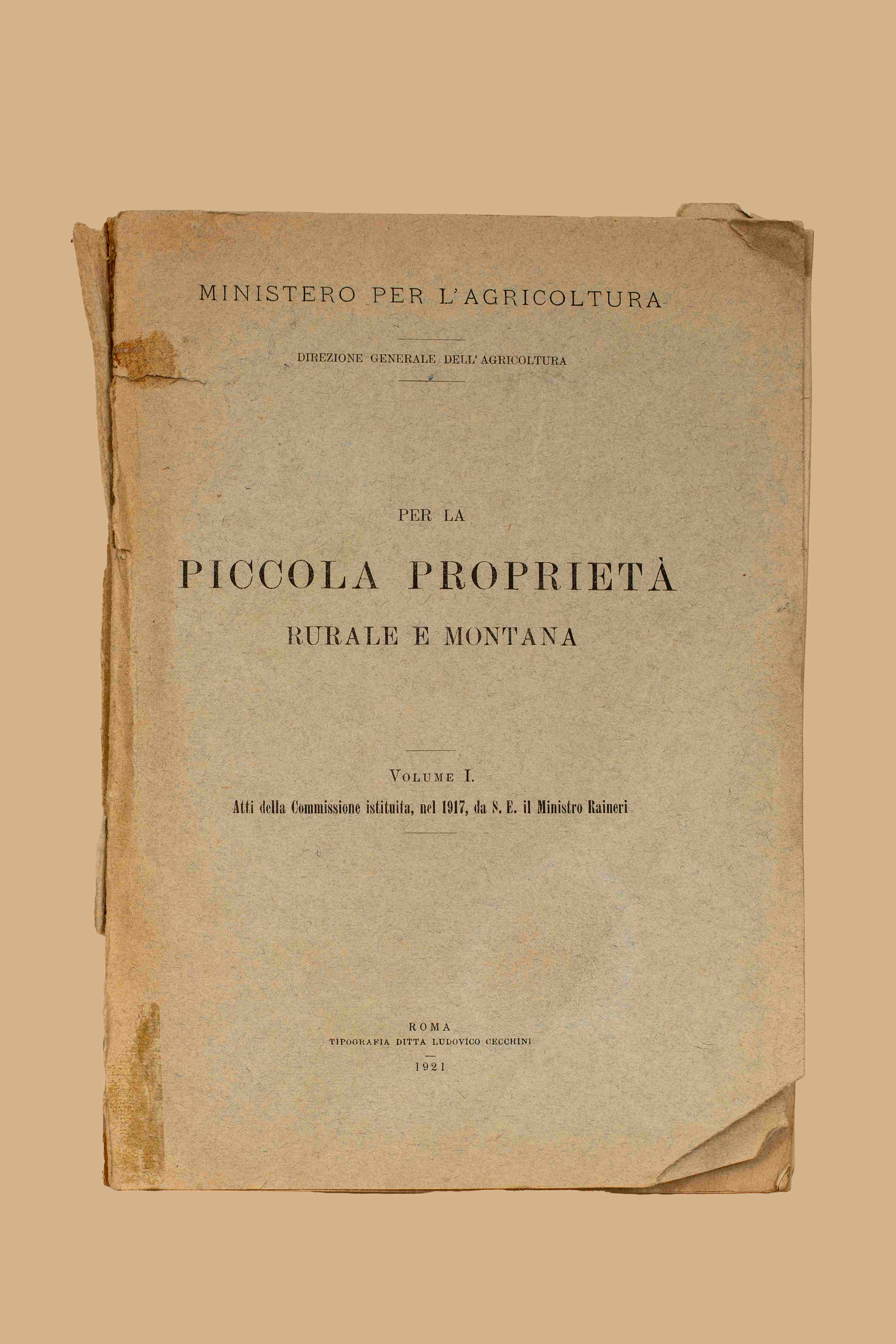 - Per la piccola proprietà rurale e montana. 1: Atti della commissione istuituita nel 1917 da S. E. il ministro Raineri / Direzione generale dell'agricoltura. - Roma : Tipogr. L. Cecchini, 1921. - 164 p. ; 27 cm. - In testa al front. : Ministero per l'agricoltura. Direzione generale dell'agricoltura.