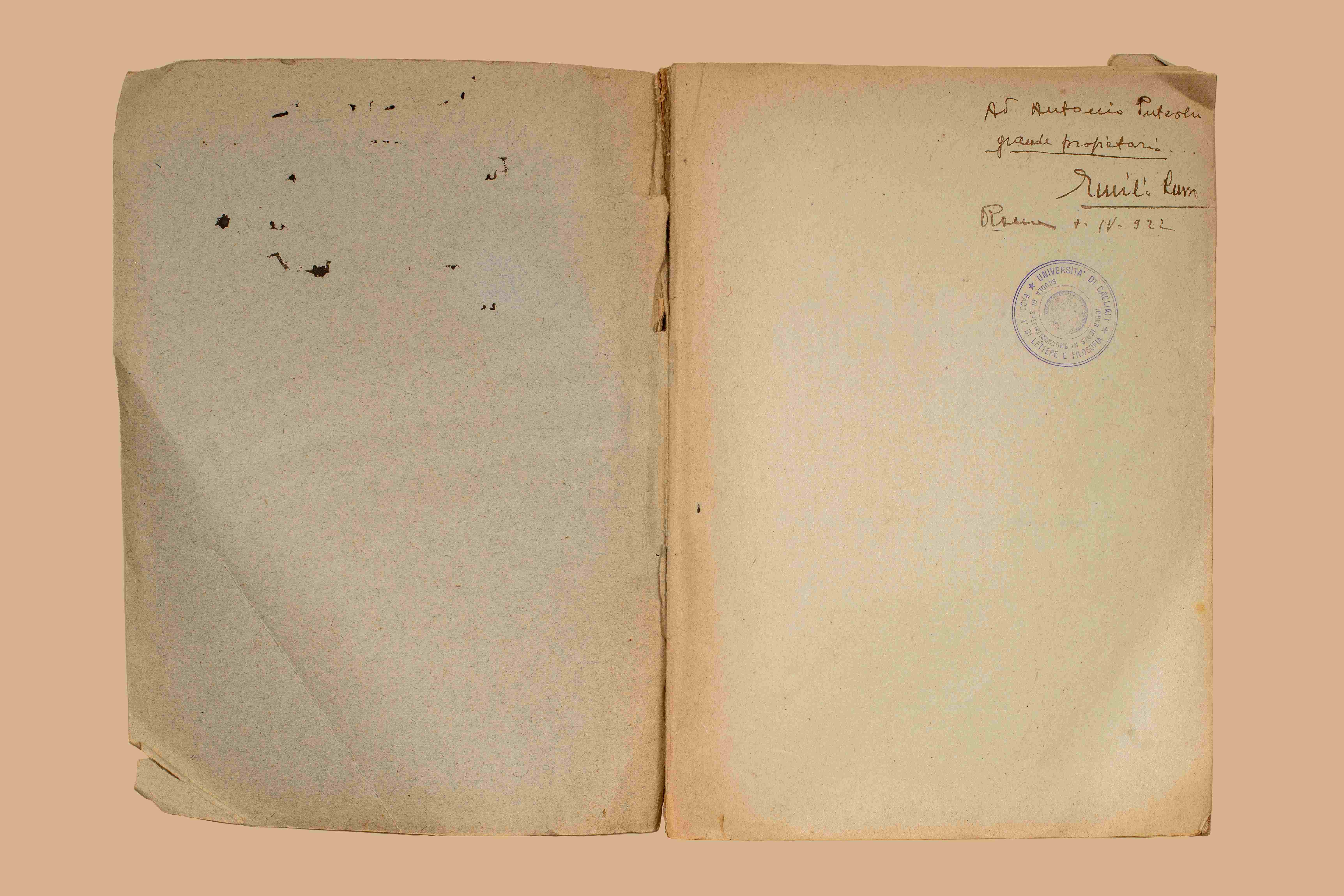 - Dedica di Lussu nell'occhietto. “Ad Antonio Putzolu, grande proprietario … Emilio Lussu, Roma, 7.IV.922”. All'interno numerosi appunti ms. e ds. sul problema dell'agricoltura; opuscolo a stampa indirizzato "all'On. Avv. Emilio Lussu, Deputato al Parlamento" in dat. 31.5.22, con la deliberazione del Comune di Loceri di chiedere al Governo la sospensione delle tasse a causa della siccità; opuscolo a stampa con il rissunto della discussione dei presidenti delle Latterie sociali cooperative sarde del 27 aprile 1922; fascicolo della rivista La Cooperazione: organo della Federazione italiana delle cooperative dei combattenti", a. 2 (1922) n. 5.
