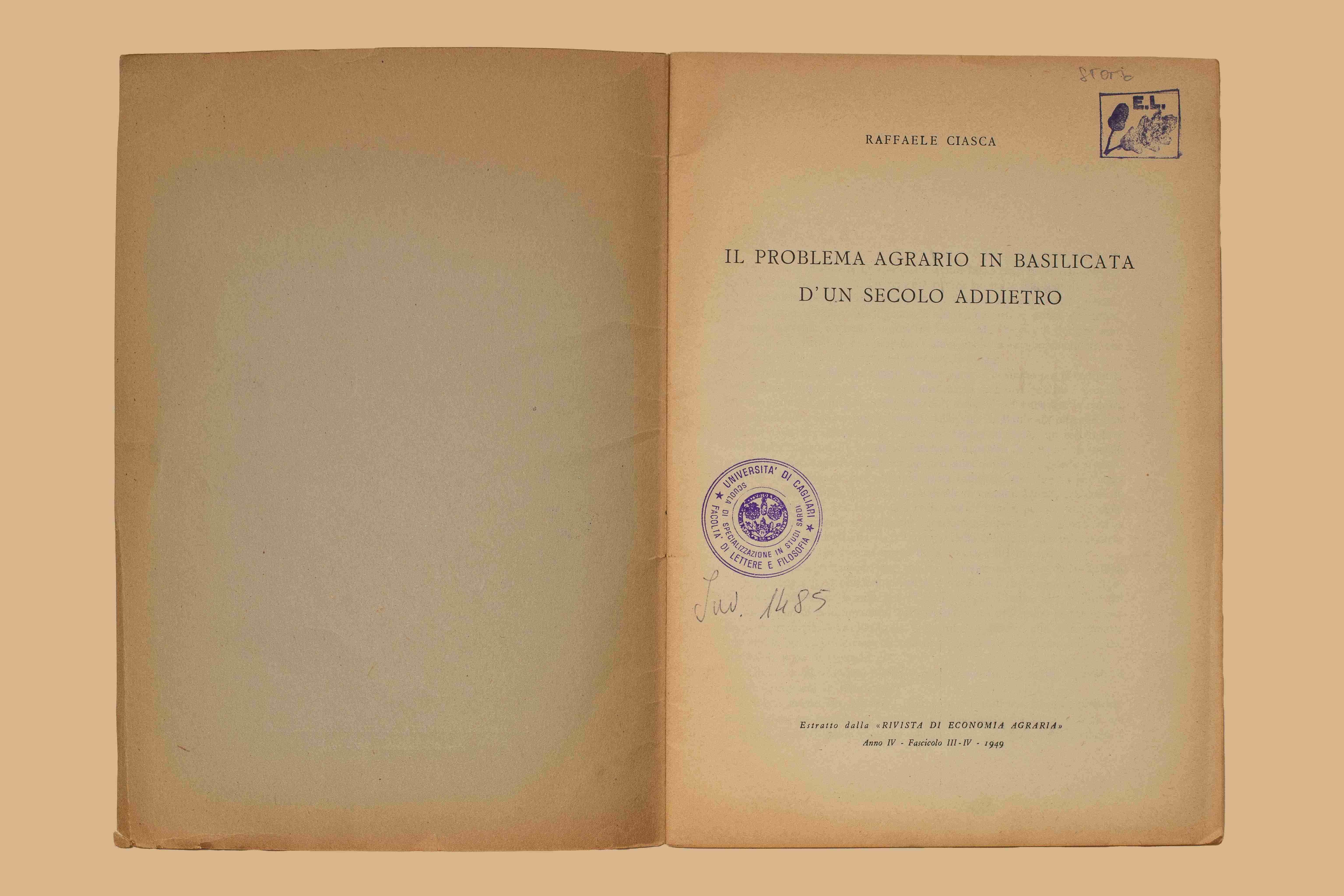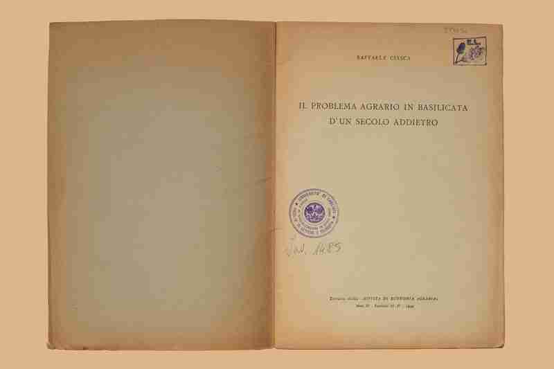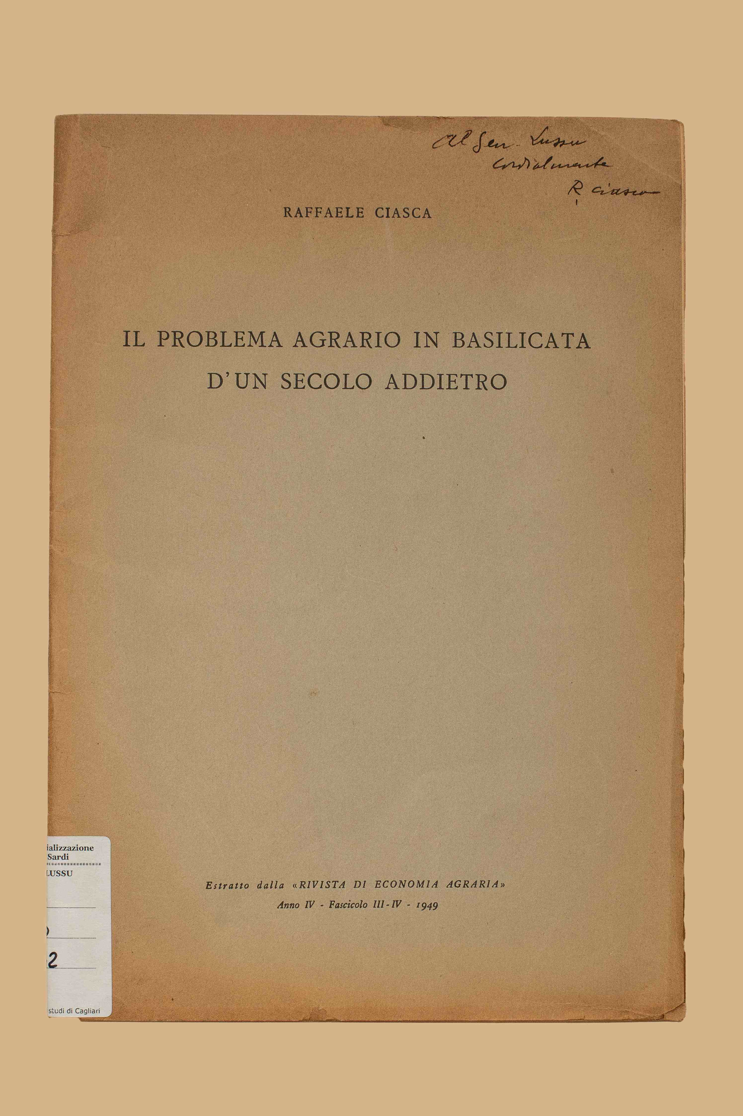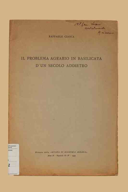 Titolo: Il problema agrario in Basilicata d'un secolo addietro / Raffaele Ciasca. - [S. l. : s. n., 1949?]. - 30 p. ; 25 cm. - Estr. da: Rivista di Economia Agraria, a. 4 (1949), fasc. 3.-4.