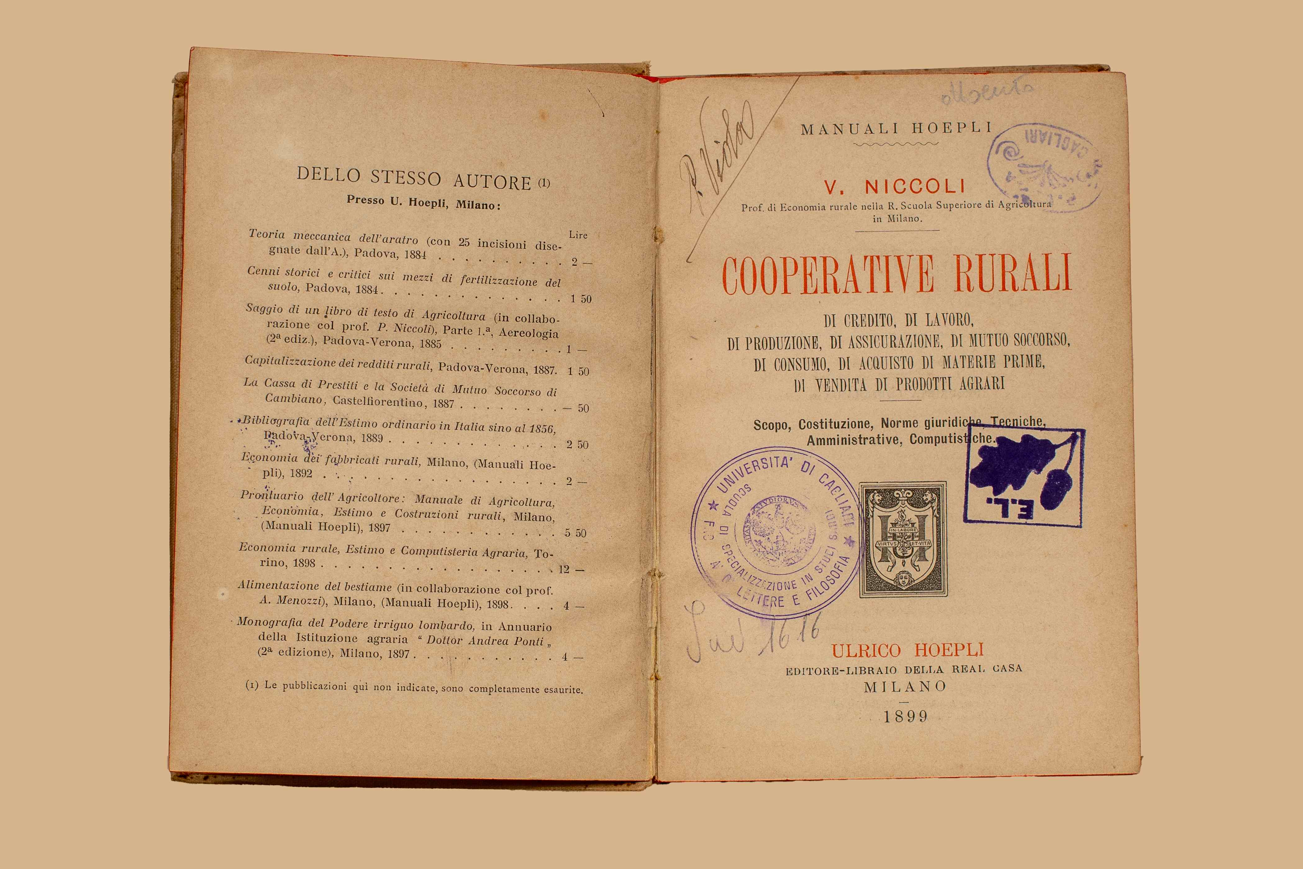 - Cooperative rurali di credito, di lavoro, di produzione, di assicurazione, di mutuo soccorso, di consumo, di acquisto di materie prime, di vendita di prodotti agrari : scopo, costituzione, norme giuridiche, tecniche, amministrative, computistiche / V. Niccoli. - Milano : U. Hoepli, 1899. - VII, 361, 64 p. ; 16 cm. - (Manuali Hoepli)