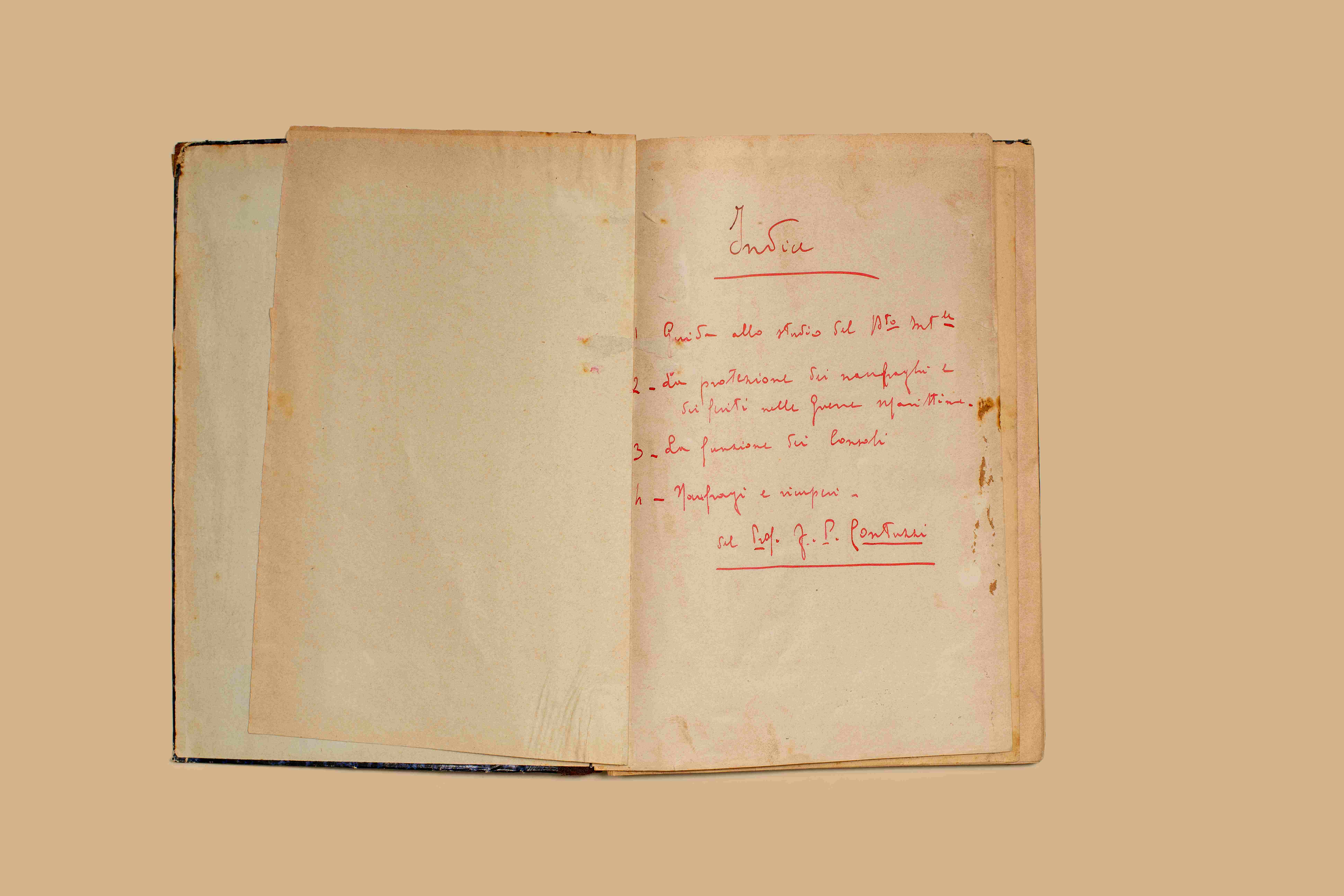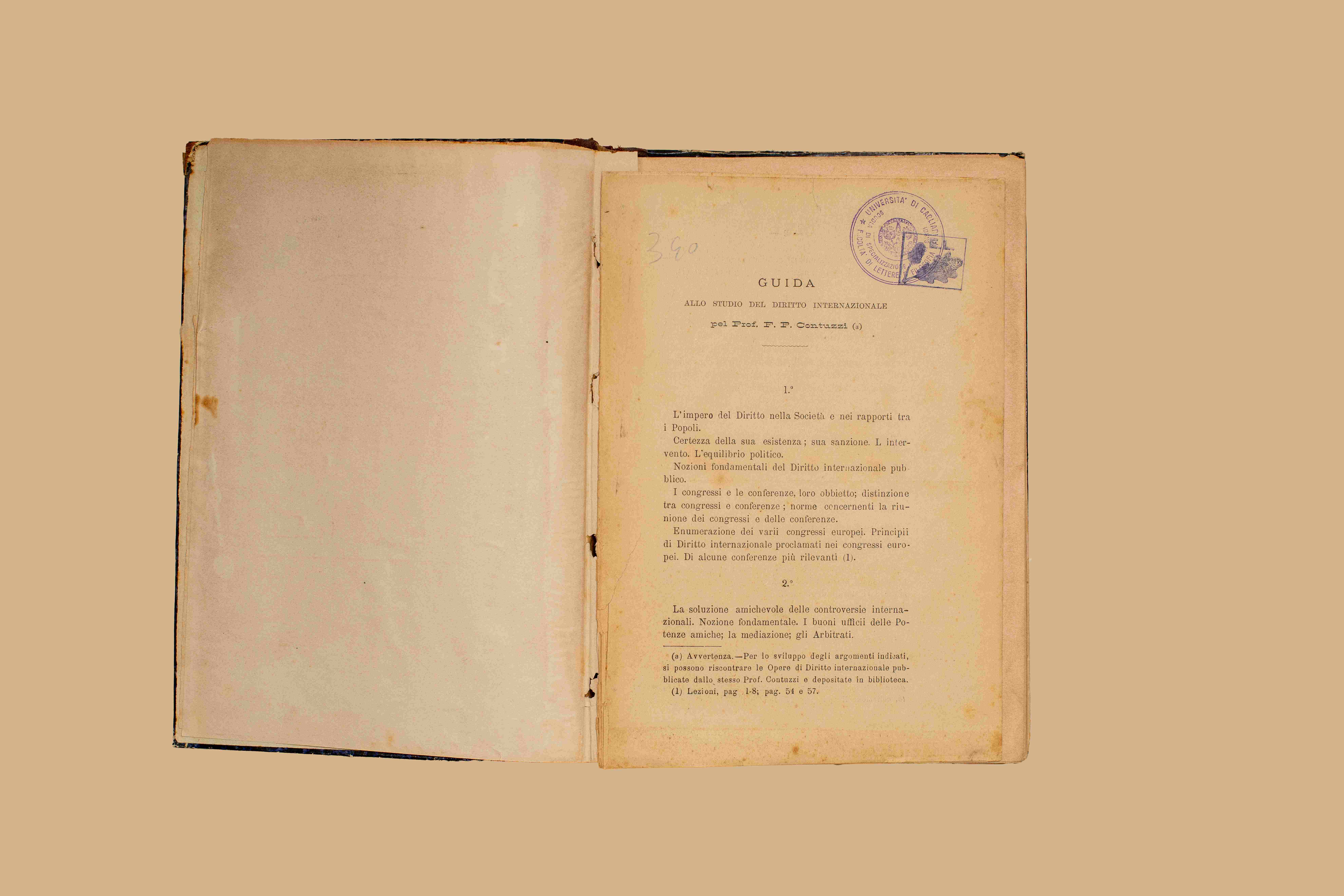 - Legato con 'Le funzioni dei consoli' e 'Dei naufragi e dei recuperi'. Legatura in mezza tela con piatti marmorizzati nero e blu. Inserito nella rilegatura, come frontespizio comune, un foglio con l’indice del contenuto. Sono indicati i seguenti testi: “1 - guida allo studio del d.to int.le // 2 - La protezione dei naufraghi e dei feriti nelle guerre marittime // 3 La funzione dei consoli // 4 Naufragi e recuperi // del prof. F. P. Contuzzi”. Segue un fasc. di 8 pp. a stampa intitolato “Guida allo studio del diritto internazionale del prof. F. P. Contuzzi” contenente per punti l’indice degli argomenti trattati ed i relativi riferimenti bibliografici; vi si fa inoltre riferimento alle opere del prof. Contuzzi sul diritto internazionale “depositate in biblioteca”.