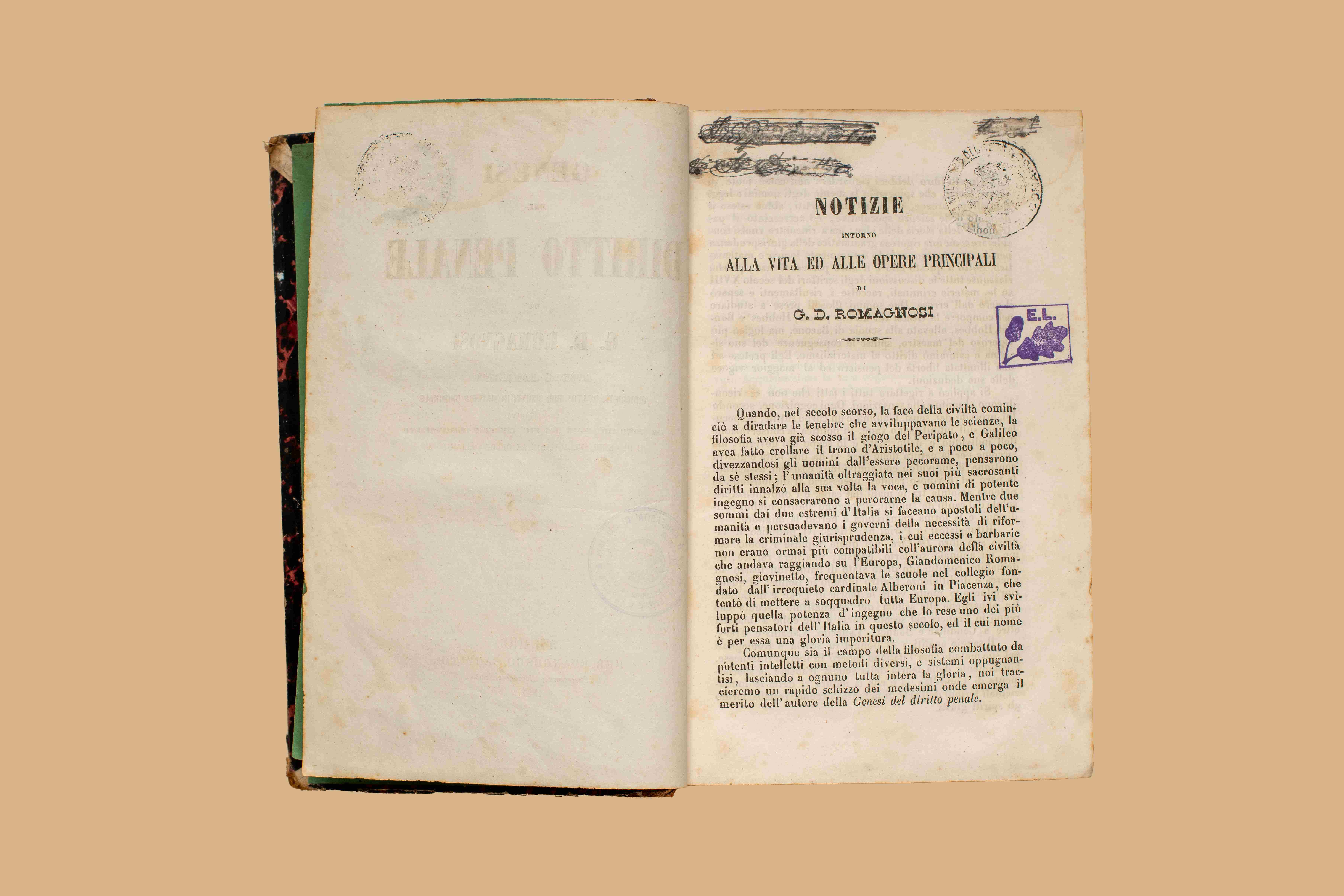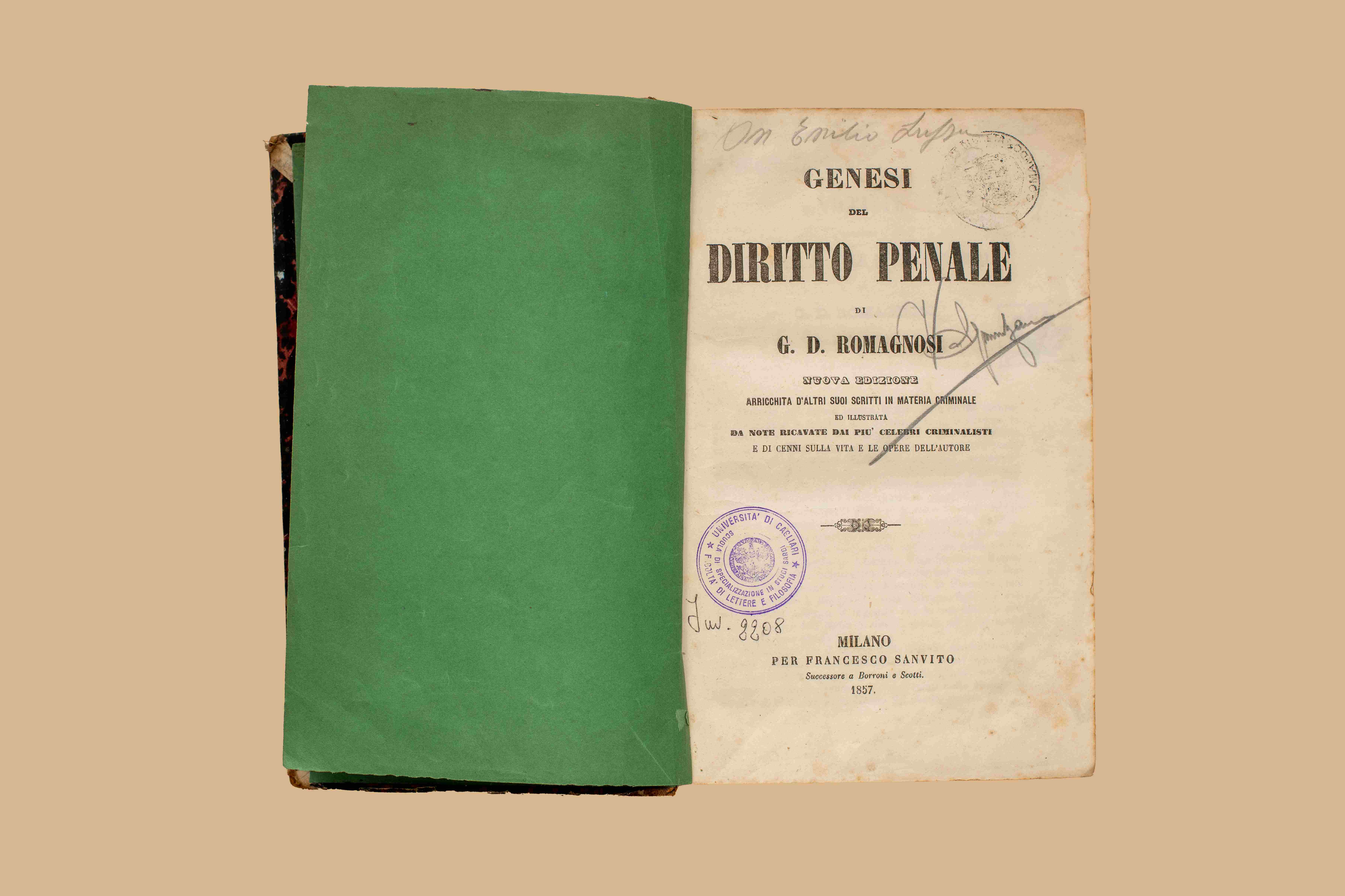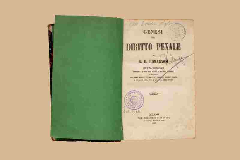 - Genesi del diritto penale / di G. D. Romagnosi. - Nuova ed. arricchita d'altri suoi scritti in materia criminale ed illustrata da note ricavate dai piu celebri criminalisti e di cenni sulla vita e le opere dell'autore. - Milano : F. Sanvito, 1857. - LXXIX, 810 p., 1 c. di tav. : ritr. ; 24 cm. - (Biblioteca scelta del Foro criminale italiano ; 9)